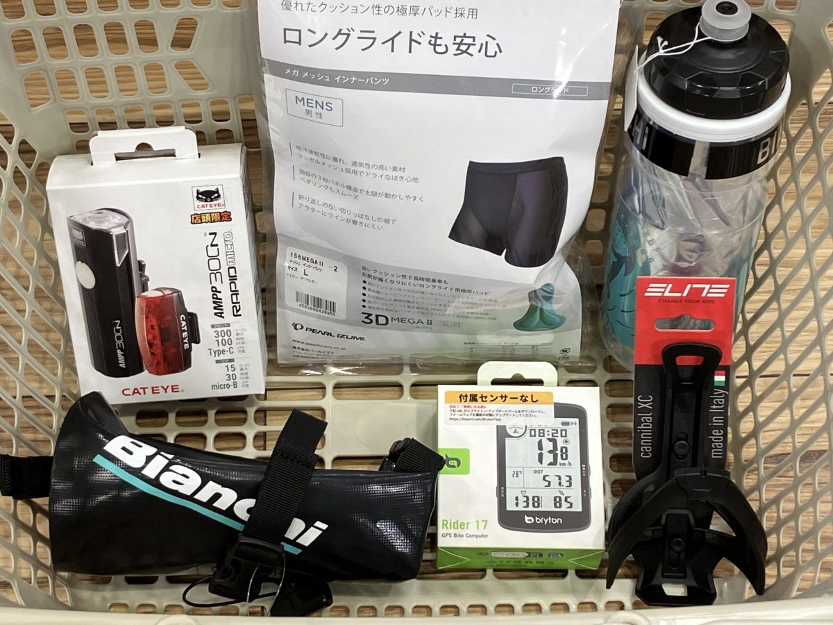 フロントライト、リアライト、サイクルコンピューターにボトルケージと保冷ボトルとサドルバッグ(BIANCHI!)そしてロングライドも安心な分厚いメガパッド付きインナーパンツ。これ全部購入してもまだポイントは余っています。