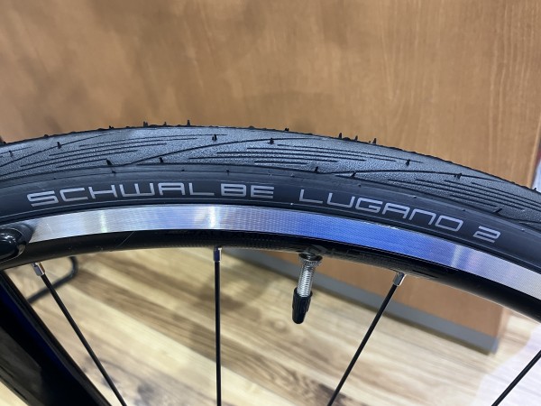 タイヤはSchwalbe Lugano 700x28Cがついておりリムブレーキとしてはかなり太めのタイヤになっております。太めのタイヤはグリップとクッション性に優れており安心感があります。