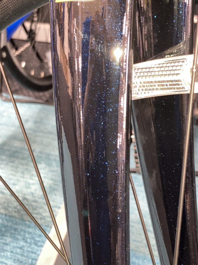 黒っぽく見えるフロントフォークは光を当ててみるとキラキラ光る深いブルーのような独特のカラー。単色もカッコイイですがこういうのもアリです!