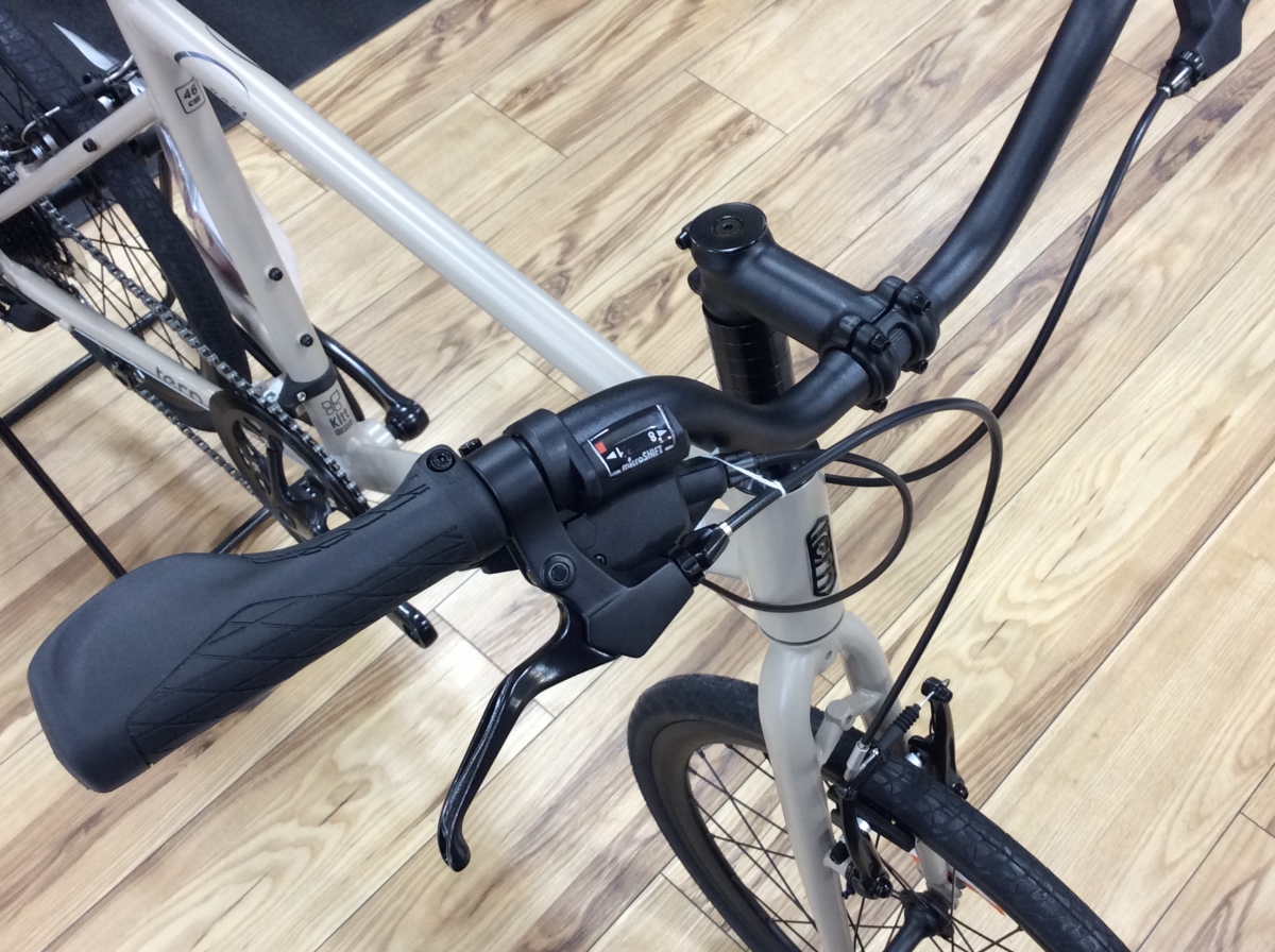 グリップは手の平の接触面積が広いエルゴグリップ、ブレーキレバーはスポーティな2フィンガータイプ、シフターはマイクロシフトの変速レバーが採用されています。