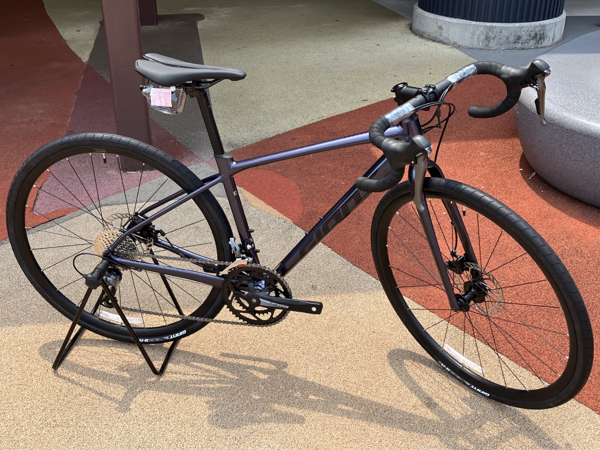 GIANTのオールラウンドロードバイクCONTEND AR。どちらかというとオールロードやエンデュランスロードよりに見えますがGIANTお得意のスローピングした軽量高剛性なフレームに太めのタイヤと機械式DISCブレーキを搭載した道を選ばずに走れるロードバイクです。
