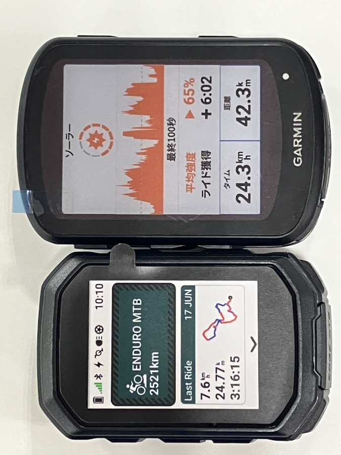 画面下側がEdge MTB、上側が展示模型のEdge 840ソーラー(540とほぼ同サイズ)縦方向も横方向もどちらも一回りコンパクトになっています。