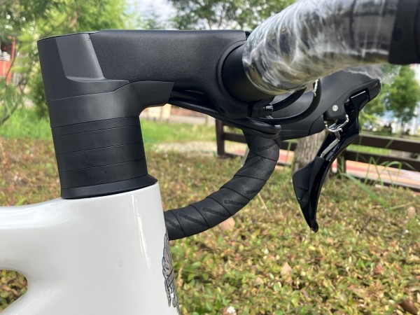 ケーブル類はステム下部で一部露出する内装タイプ、完全内装型に比べメンテナンス面なども考慮しつつ空力性能の向上とハンドル周りのパーツ取付の自由度があがるイイトコ取りなシステムです。