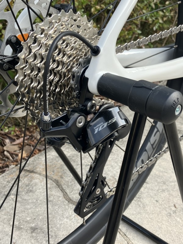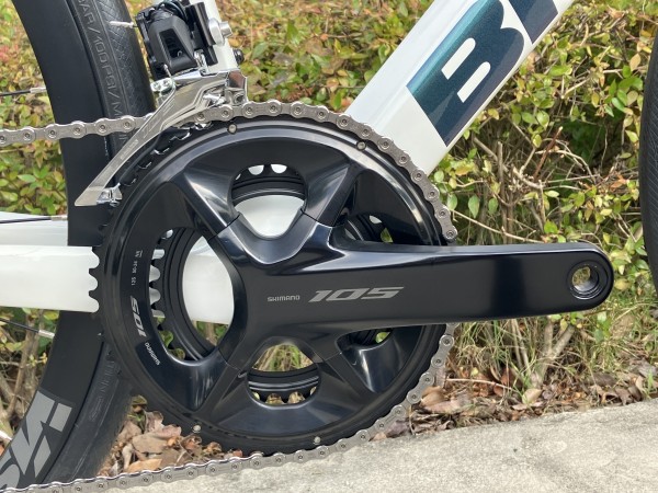 最新R7100系12速105の油圧DISCブレーキコンポ搭載。リアのスプロケットが11-34Tとワイドギアになっておりリア12段ということもありギアの過不足は少なそうです、中間域でのつながりの良いギアは滑らかな加速を産み、ローギア34Tは激坂でも変速で困る所はなさそうです。
