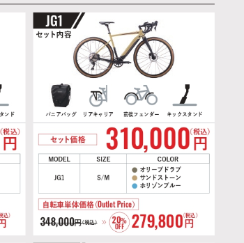 しかも、ほとんど安くなることのないE-BIKEが今回、JG1に関しては20%オフ!!