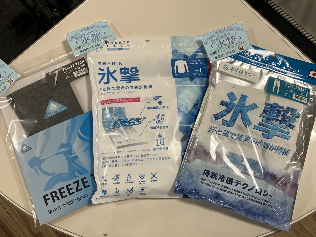 接触冷感素材の上下インナーとアームカバー。普段お使いのウェアの下に着用するだけで普段より快適に活動することができ、暑い夏場に限らず涼しく過ごしたい場面では有用なアイテムになります。
