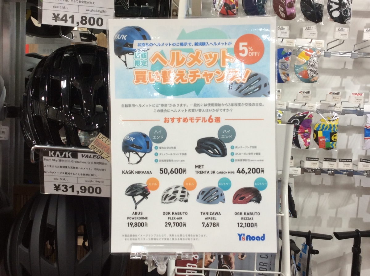 今お使いのヘルメットを提示していただくと新しく購入するヘルメットが5%OFFになるキャンペーンもやってます!