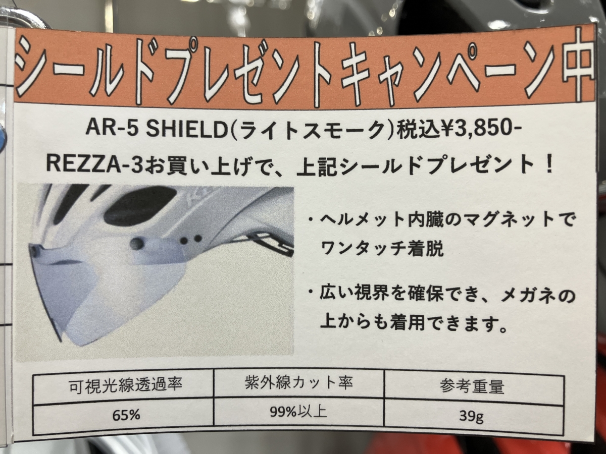 本来別売りのAR-5シールド(¥3,850-)がいまなら無料でプレゼント!!シールドはライド中に飛んでくる異物から目や顔を守るためにもぜひご活用ください。キャンペーンでのプレゼントは先着になってしまいますご了承ください。