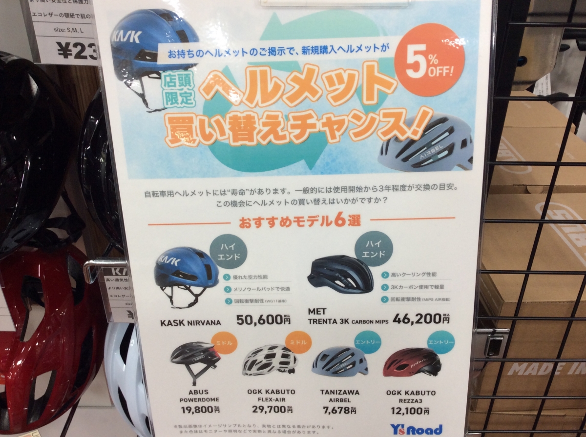 買い換えをするならお得です!ヘルメットの種類は問いません。使用中のヘルメットを店頭で提示していただくだけで5%OFFです!