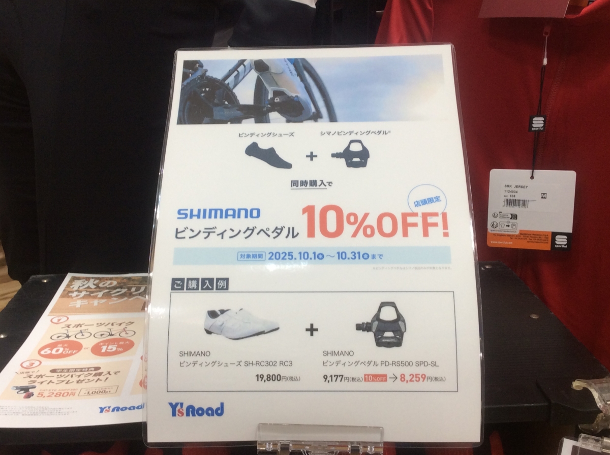 店頭限定になりますが、今ならシマノ製のビンディングシューズ+ビンディングペダルを同時購入で、シマノ製のビンディングペダルが10%OFFのキャンペーン開催中です!
