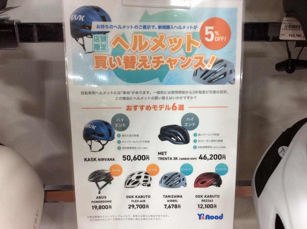 今お使いのヘルメットをスタッフに提示して頂くと新しく購入するヘルメットを5%引きさせて頂きます!