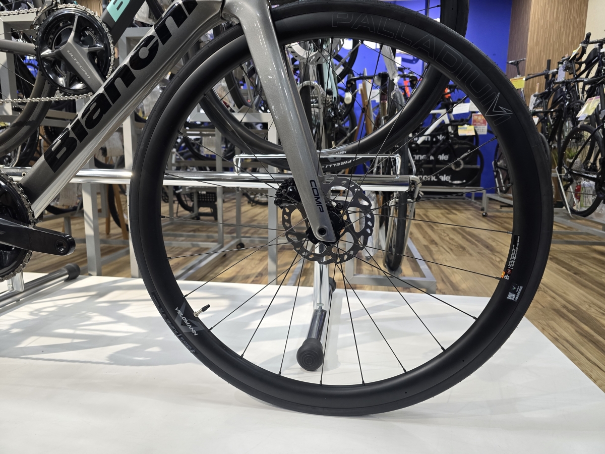 こちらの車体に標準で取り付けられているVelomann Palladium 33mm profileは重量が1460g(±5%)と軽く、リムハイトも33mmなので、ヒルクライムに持って来いですね!