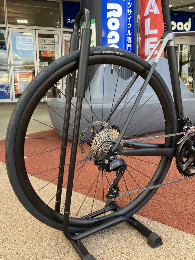 軽量なカーボンフレームにシマノ12速105搭載、軽量な車体と強力な油圧ディスクブレーキで下りも安心の車体です。