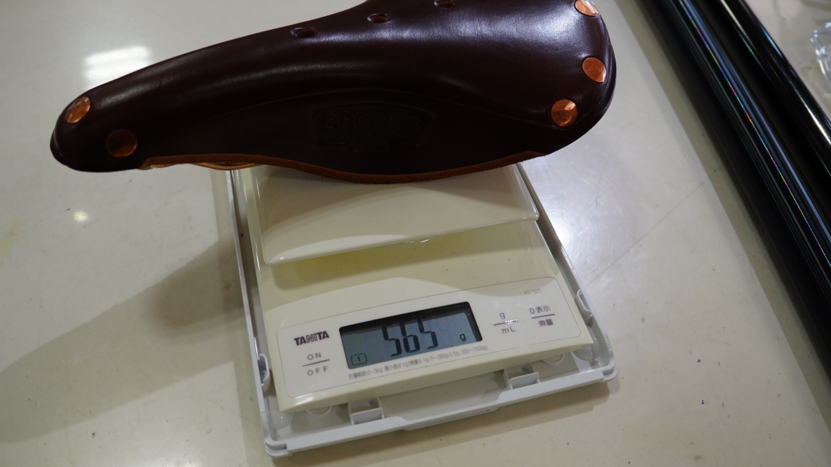 純正サドルは276g(P-LINE)、BROOKS B17 SPECIALは565gでした。