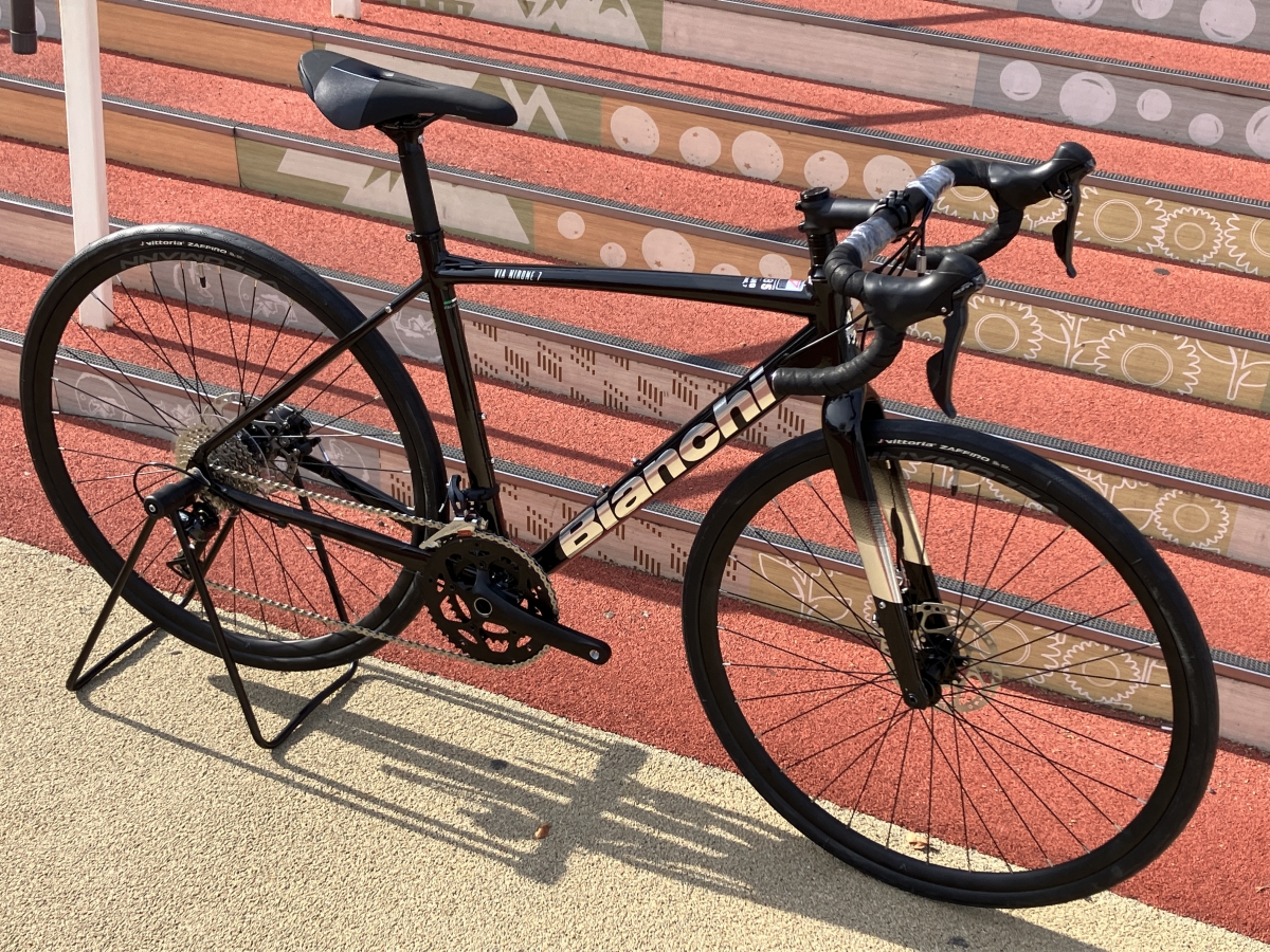 ロードとしては比較的太めの32Cに機械式ディスクブレーキ装備。アップライトなハンドル位置にになりやすいジオメトリになっており前傾姿勢も控えめで乗りやくなっています。