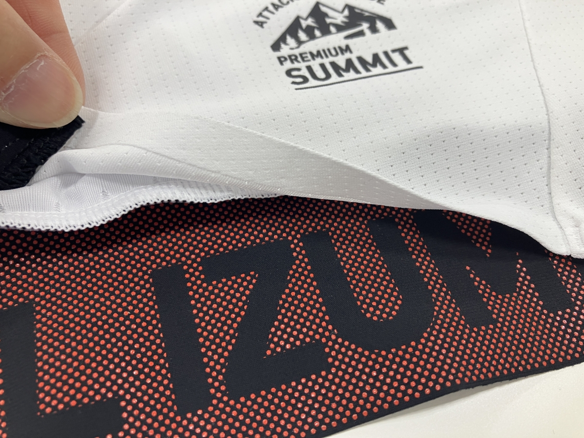 ちなみに裾部分は縫い目の無い圧着処理になっておりしなやかで生地の厚みも最低限の増加に留めています。背面側はずり上がり防止のストッパーが配置されておりこちらはカットオフ仕様と使い分けがされています。