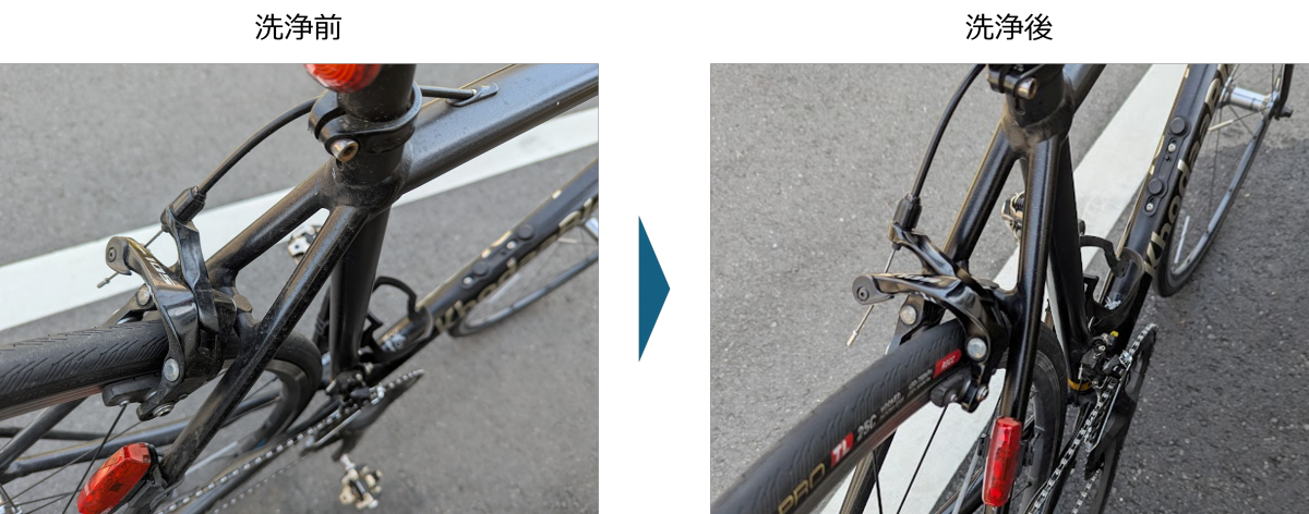 続いて車体の洗浄へ。日々の通勤で結構汚れをため込んでしまっていますが、こびりつくほどの汚れにはなっていない模様。バイクシャンプーを吹きかけて掃除していきますが…スプレーするのが楽しくて写真撮り忘れました。前後比較をご覧ください。いつもはWako’sさんのフォーミングマルチクリーナーを使っているのですが、これも使用感結構違いました。Wako’sさんの方は吹きかけたらしっかり泡になるので、泡が消え始めたころにふき取る、という感じで使っていますが、シュアラスターさんのバイクシャンプーは、付属のスポンジで優しくこすることで泡がどんどんたってくる感じでした。