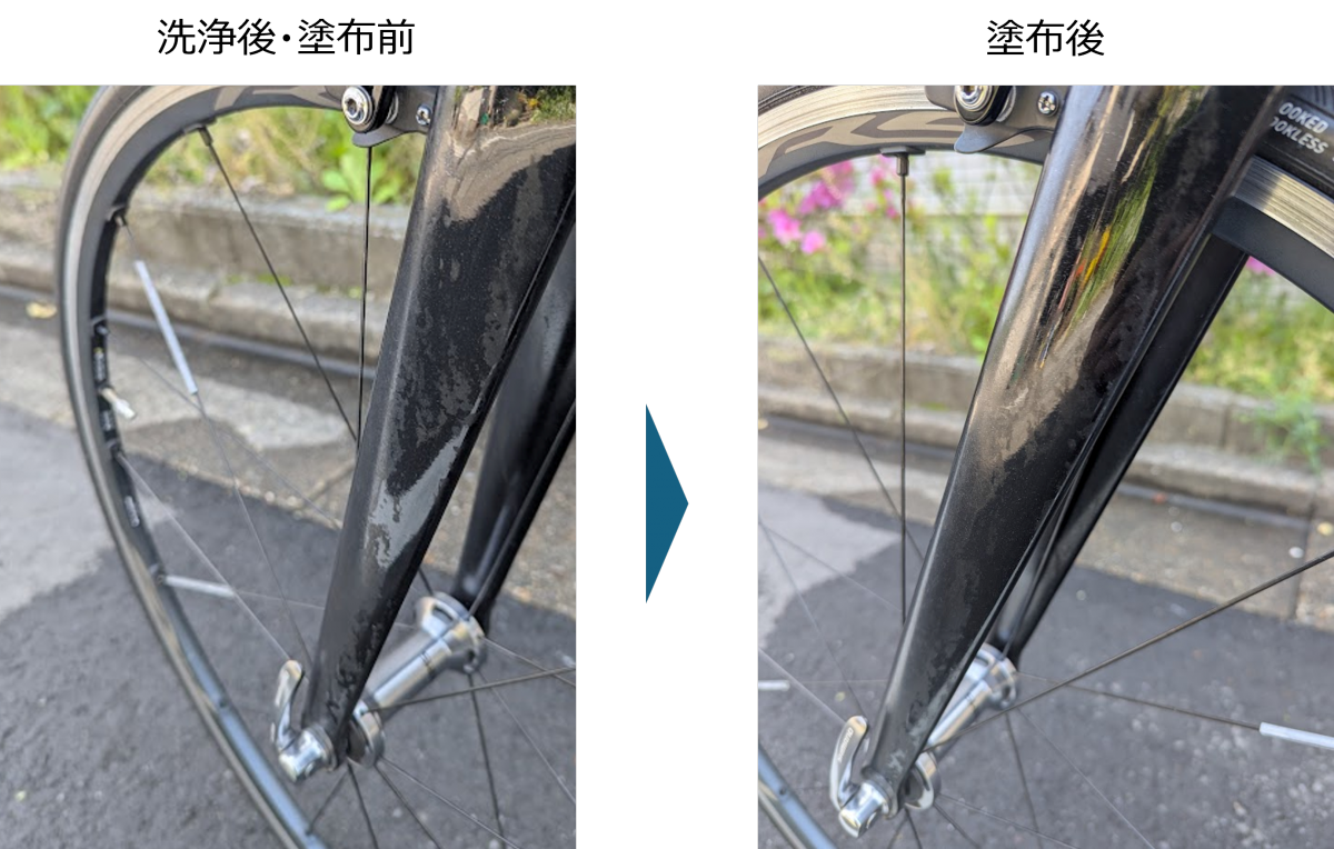 ええ、写真は光線の具合の差です。フォークのまだら模様は、実は以前、洗浄しているときにやらかしまして、塗装がちょっと剥げております。そこのまだら模様がわからなくなるほどの効果はありませんでした。これはさすがに無理な望みでした。主な効果は、撥水効果のコーティングによって汚れが付きにくくなることなので、そこに期待です。