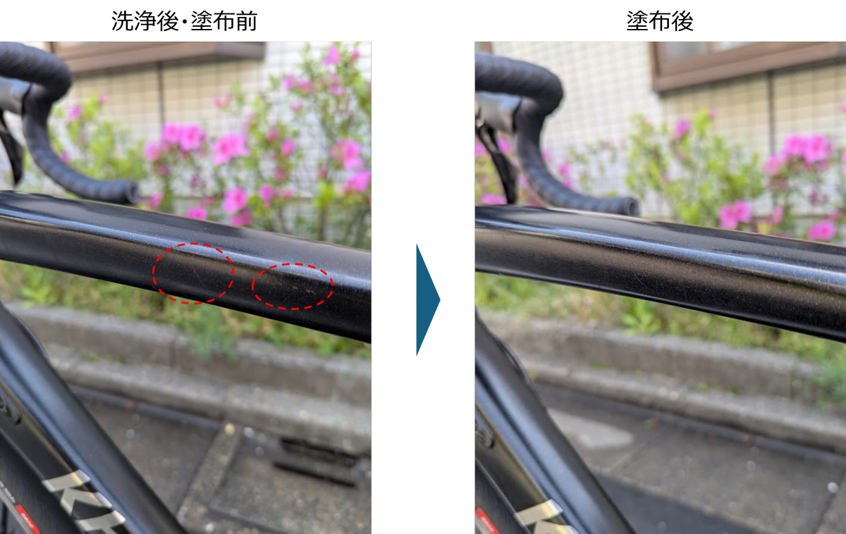 ただ、個人の感想なのですが、トップチューブについているひっかき傷がちょっと目立たなくなったな、と思っています。写真の具合やひいき目もあると思うので、気のせいかもしれませんが。