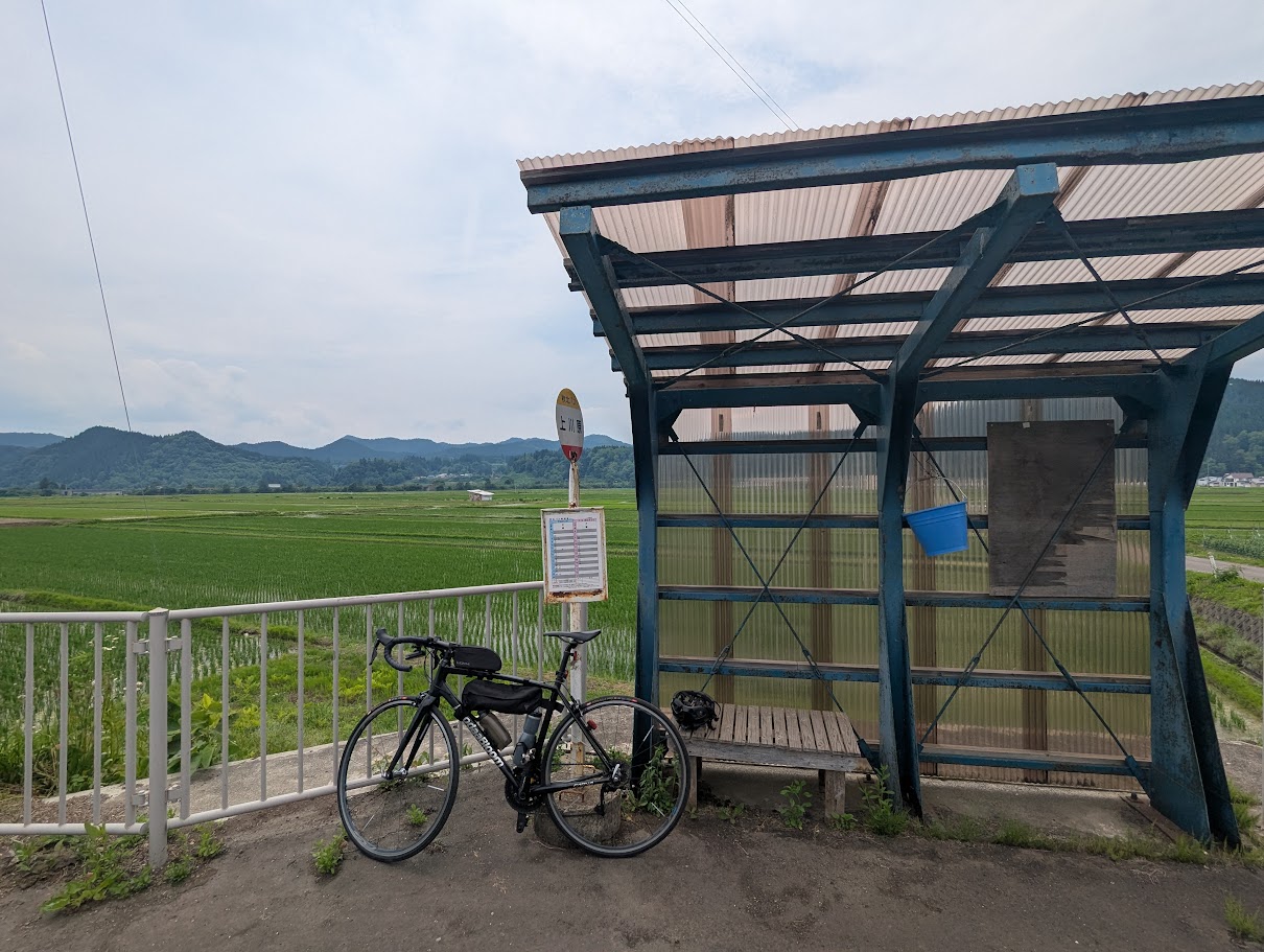 そこからも田園風景の中、平坦の道を走り続けるのですが、主催のお話にあったように、たまにトラップのような小さい陥没孔があって、「ここに刺さったらさすがにパンクだなー」とか思いながらのんびり走っていました。車もそんなに走っていないので、余裕をもってよけることはできますが、中々油断ならないサイクリングでした。雪国へ行かれる方はぜひお気を付けください。
