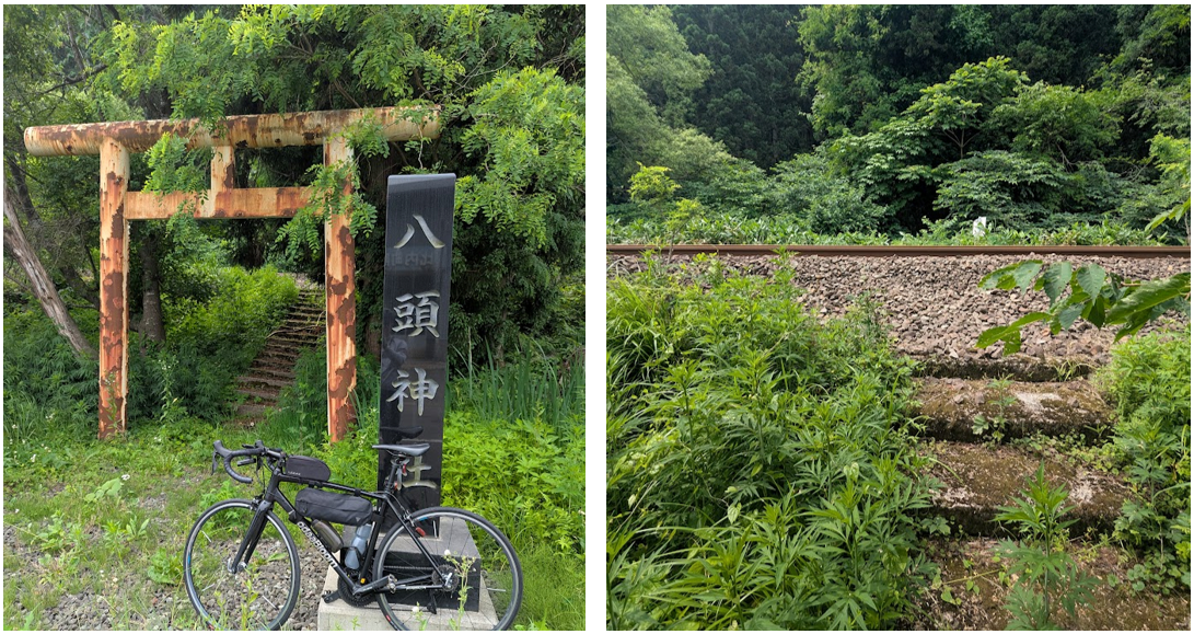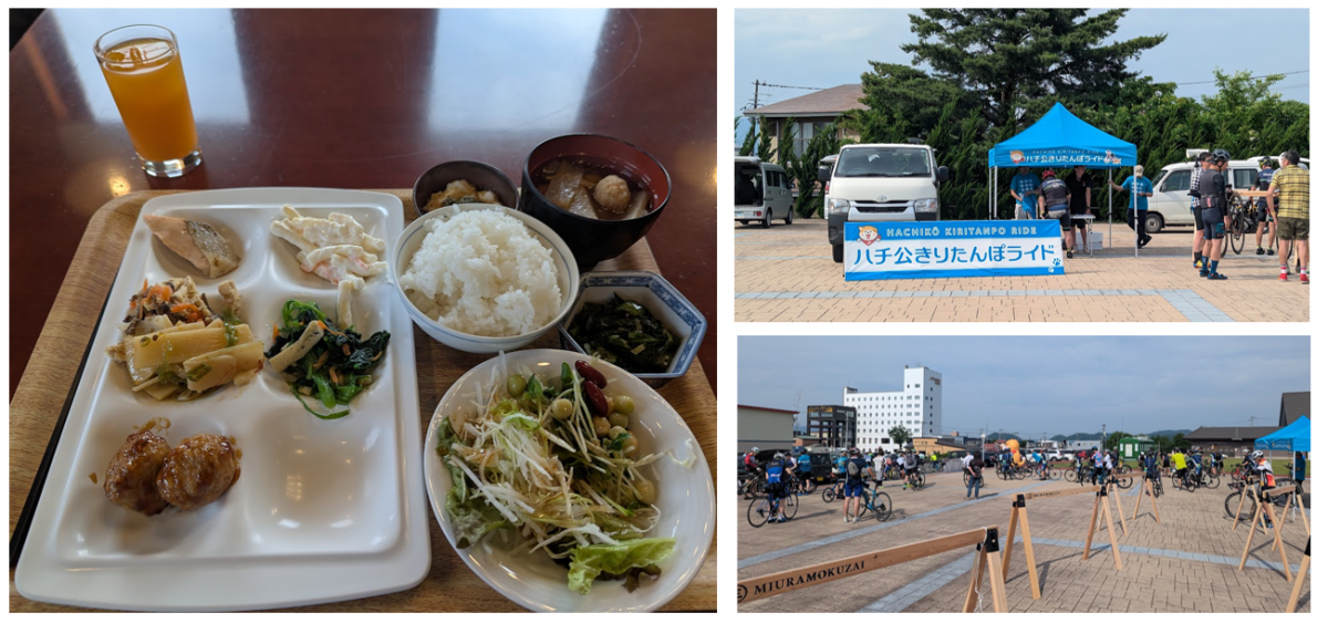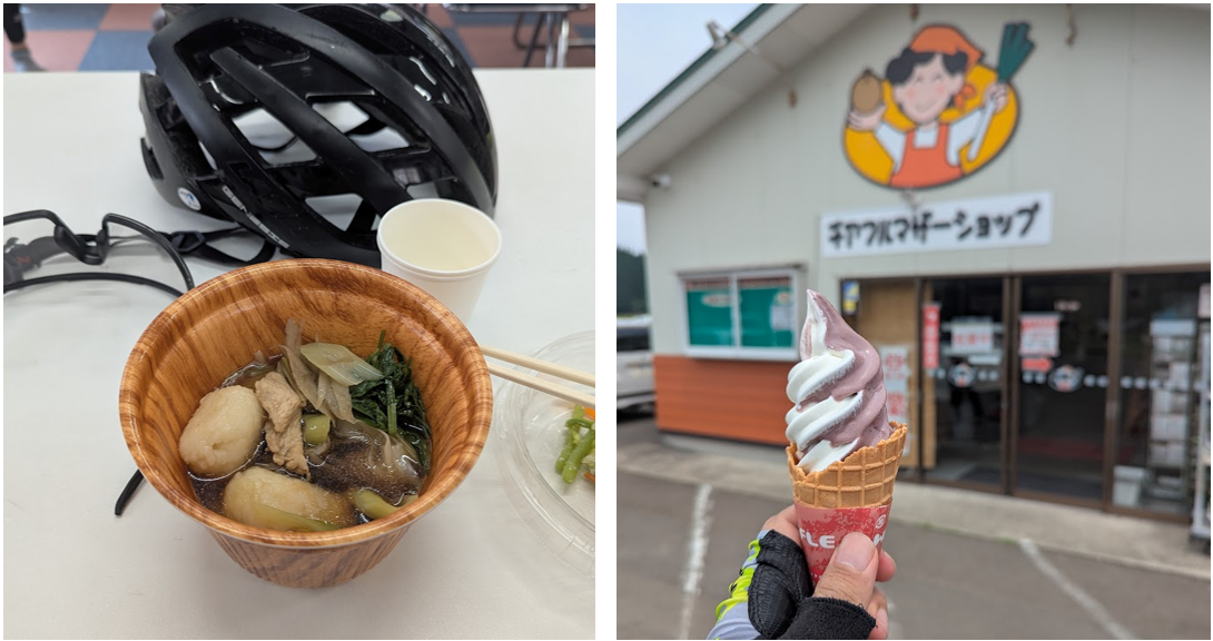 高台にある空港から下って、内陸側に走っていきますが、途中で線路が参道を横断している神社や、きれいな川を見たりしながら飽きることなく次のチェックポイントへ。ここはエイドになっておりまして、秋田名物きりたんぽとお漬物を頂きました。暑い天気に温かいスープなのでちょっと汗が噴き出ますが、疲れたところに沁みる鳥のだしときりたんぽがおいしくて最高でした。とはいえ暑いので、お隣でソフトクリームも頂きまして、リフレッシュ完了。その土地の名物を楽しみながら走るサイクリングはすばらしい。