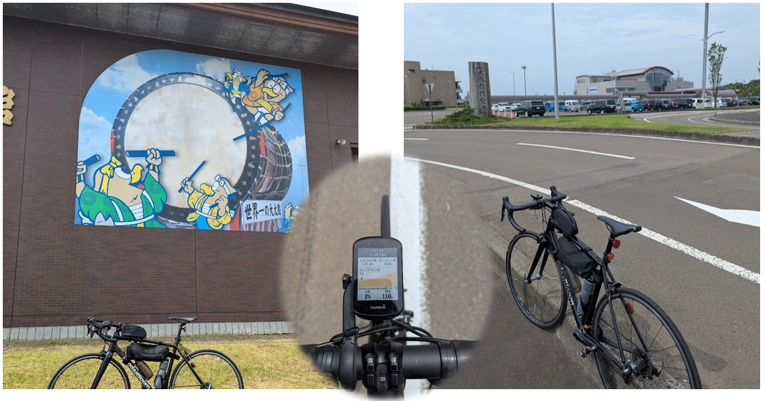 50人のイベントということで、大きな混雑もなく、無事出発。主催の方からは、「路面の荒れに気を付けて」とのこと。気を付けて走ることにします。10人のグループにお一人サポートライダーがついてくれる親切設計で、道に迷う心配も特になく順調に進行。チェックポイントになっている大太鼓の里をで休憩しつつ、大館能代空港へ。上り坂がある、と聞いていたのですが、Garmin先生の画面で明るいオレンジくらいなので、張り切りすぎないようにぼちぼち上り切りました。
