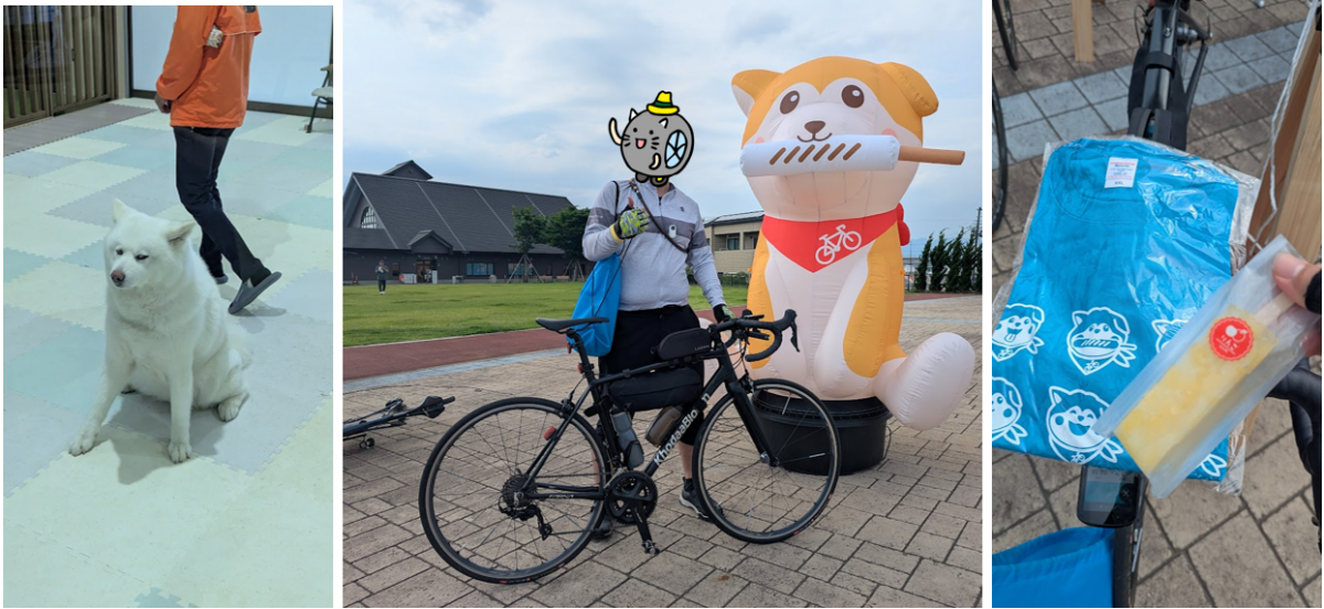 最後は下り基調でゴールまで。ゴールで記念品をもらって記念写真。ご褒美のくずアイスもおいしかったです。ゴール地点のすぐそばに秋田犬の記念館的な建物があったので、休憩も兼ねて見学。ちょうど秋田犬を見られるタイミングだったので、もっふもふの犬をガラス越しに見ながら癒されてきました。