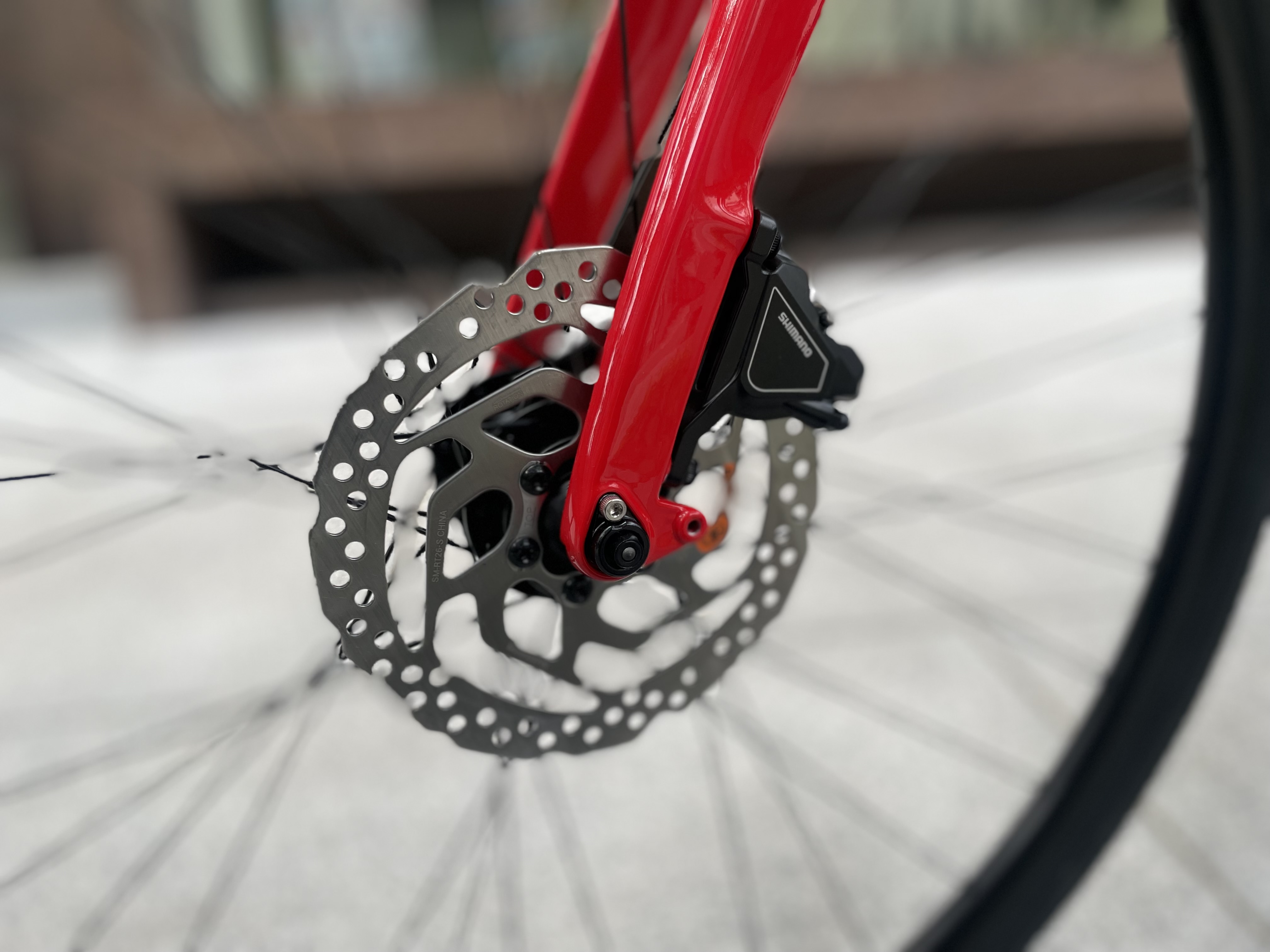 SHIMANO製の油圧式ディスクブレーキ搭載。これから梅雨時期に入りますが、雨でも自転車乗るよ~という方には油圧式ディスクブレーキがオススメです。メリットは、