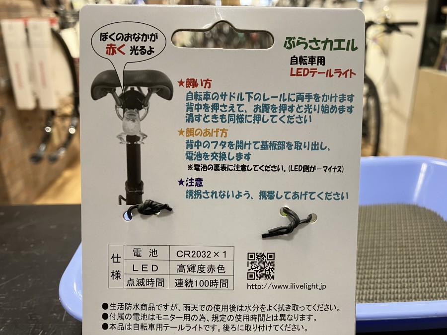 お腹を押すとこのように光りだします。意外と明るいのでテールライトとしての性能は申し分ありません。消す時も同じようにお腹を押すだけでOK!