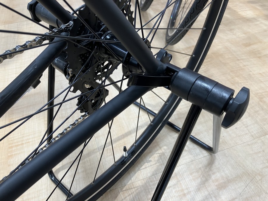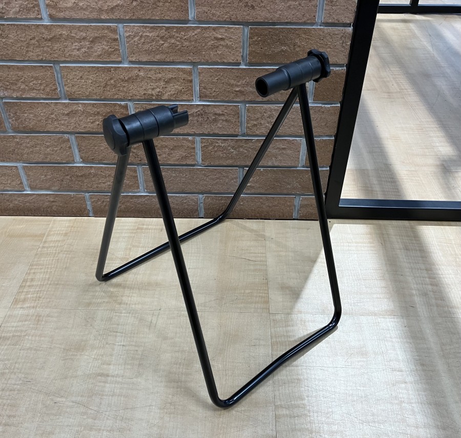 後輪を浮かせて固定するタイプのディスプレイスタンドです。そのままクランクを回すことができるのでチェーンの注油などのメンテナンスができます。