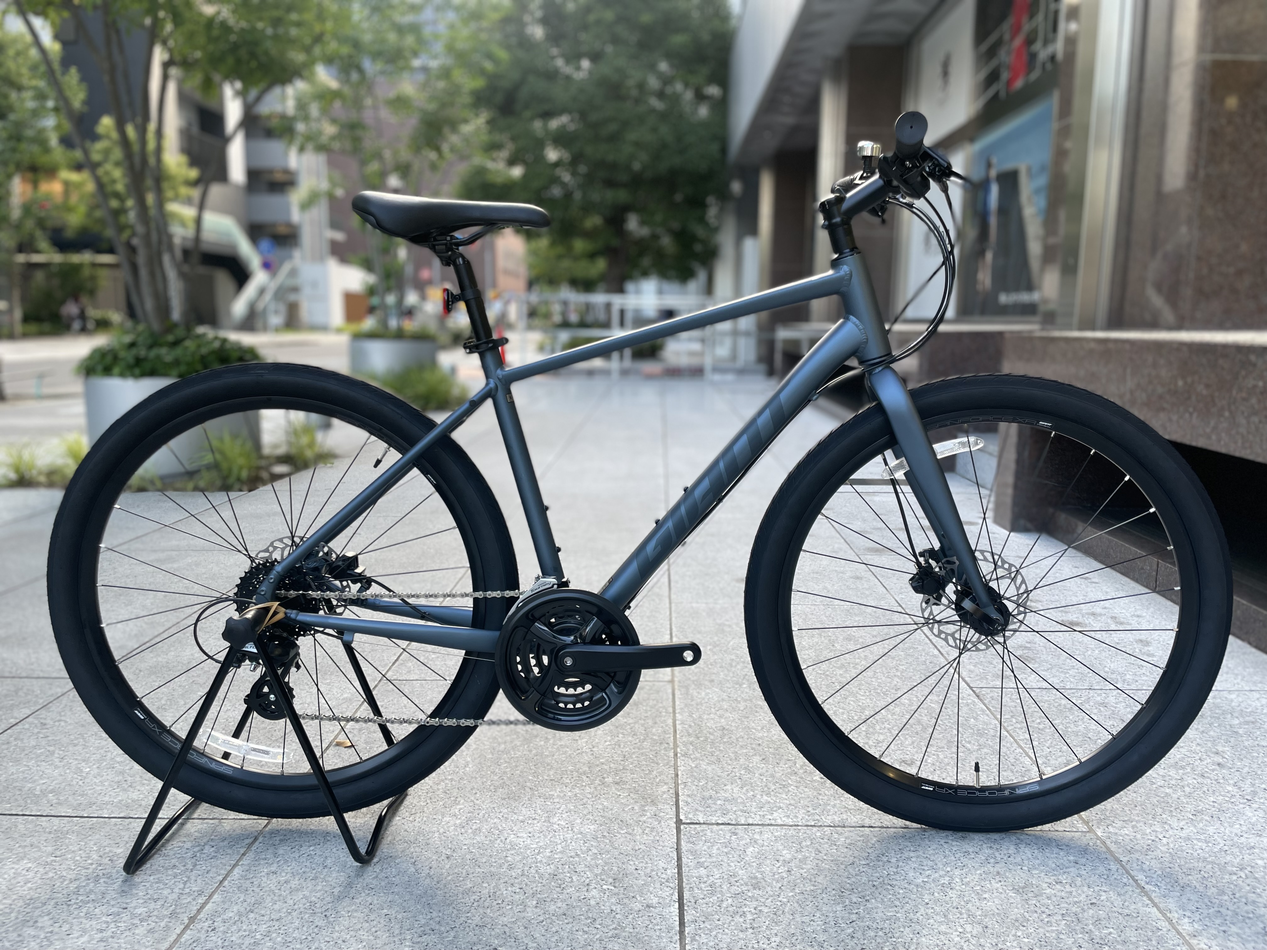 変速はSHIMANO製。クロスバイクではスタンダードな仕様のフロント3速、リア8速の24段変速です。