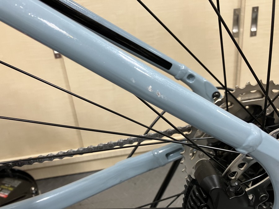 走行性能に支障がない程度の傷があり、具体的にはシートステー左側の塗装が剥げています。他にも細かい傷が見つかる場合もありますが、あくまでアウトレット品ということで、購入をご検討の際は事前に車体の状態確認をお願いいたします。