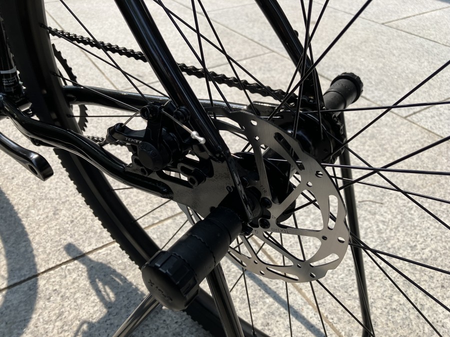 リムブレーキが多いシングルスピードですがこのモデルはなんと機械式ディスクブレーキを搭載。タイヤのクリアランスが広がり最大45Cまで履けるようになったり、雨などのバッドコンディションでも制動力が落ちにくいといった利点があります。
