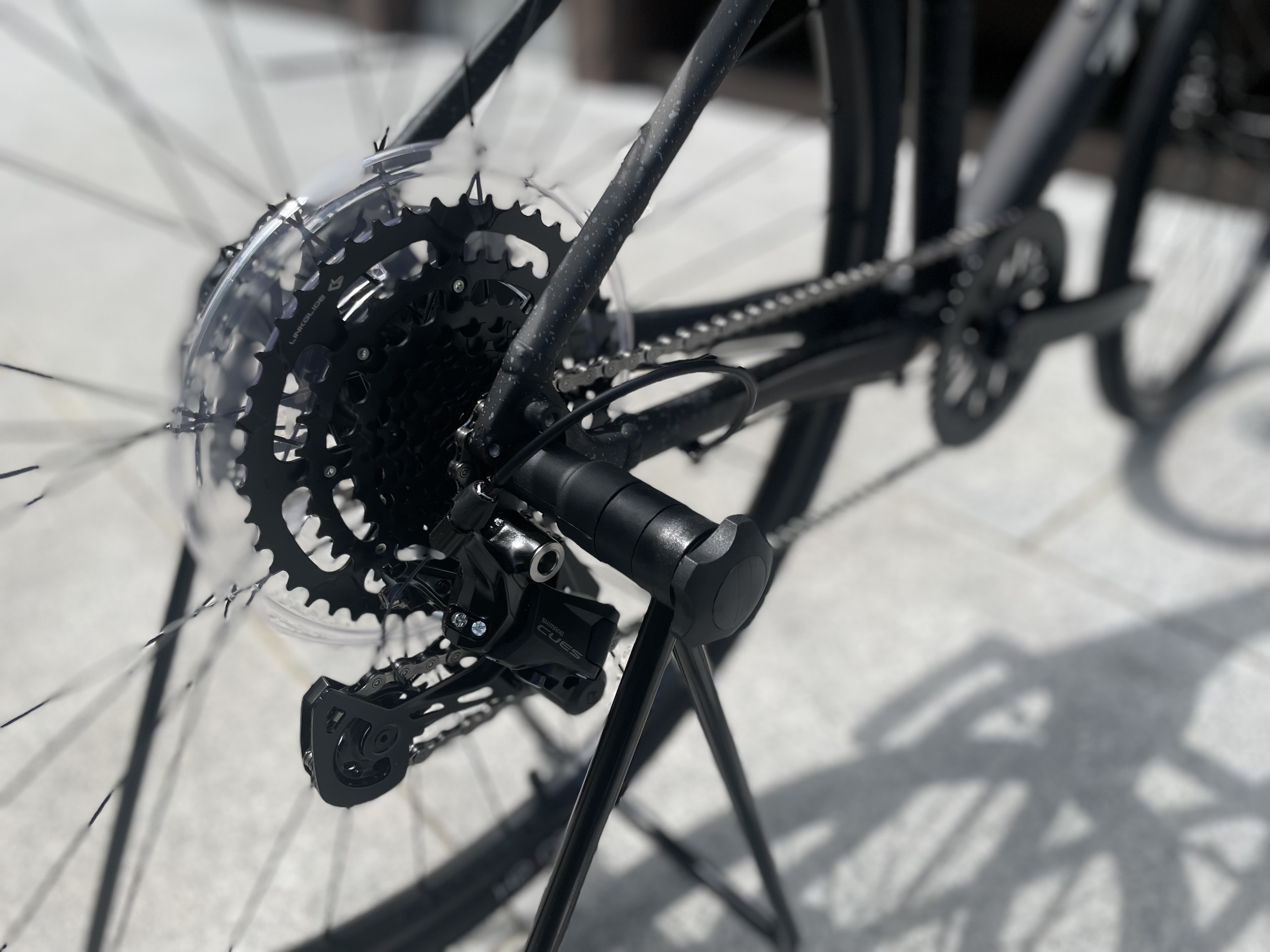 変速はフロントシングル、リア9速。SHIMANO製のCUESを採用しており、フロントの変速がなくてもリアの歯車が大きい(ワイドレシオ)ので平坦から坂道までバッチリ対応できます。