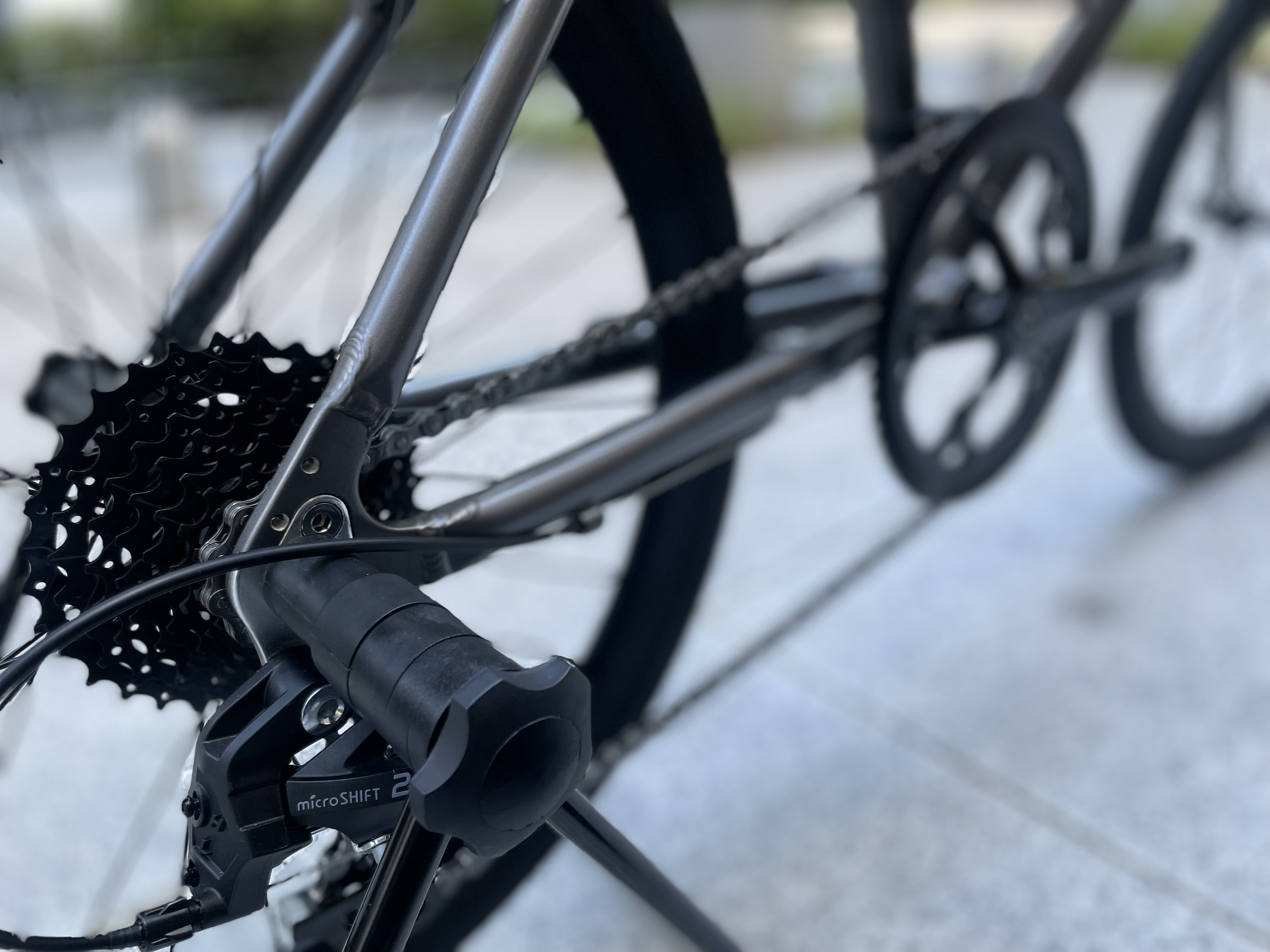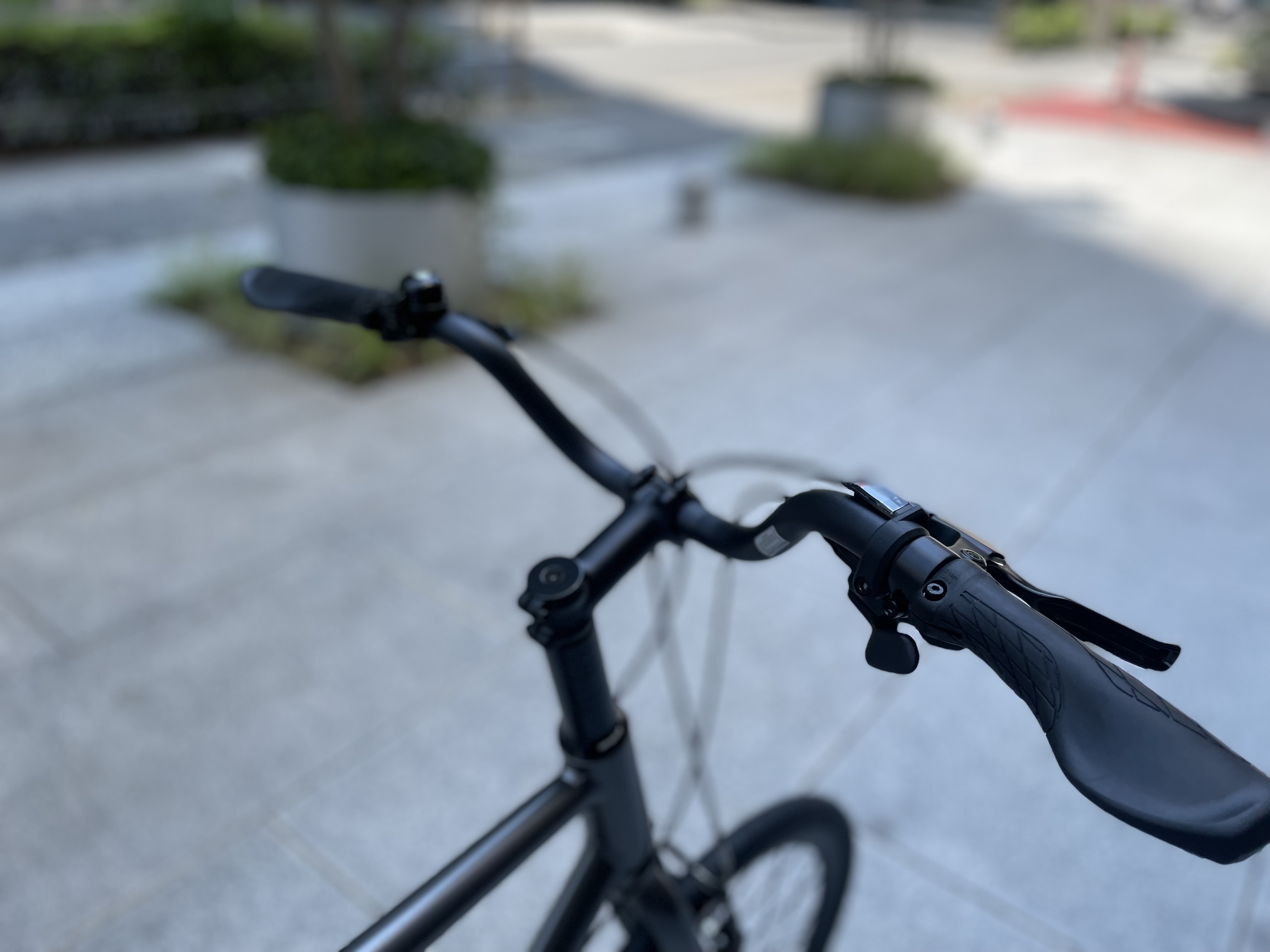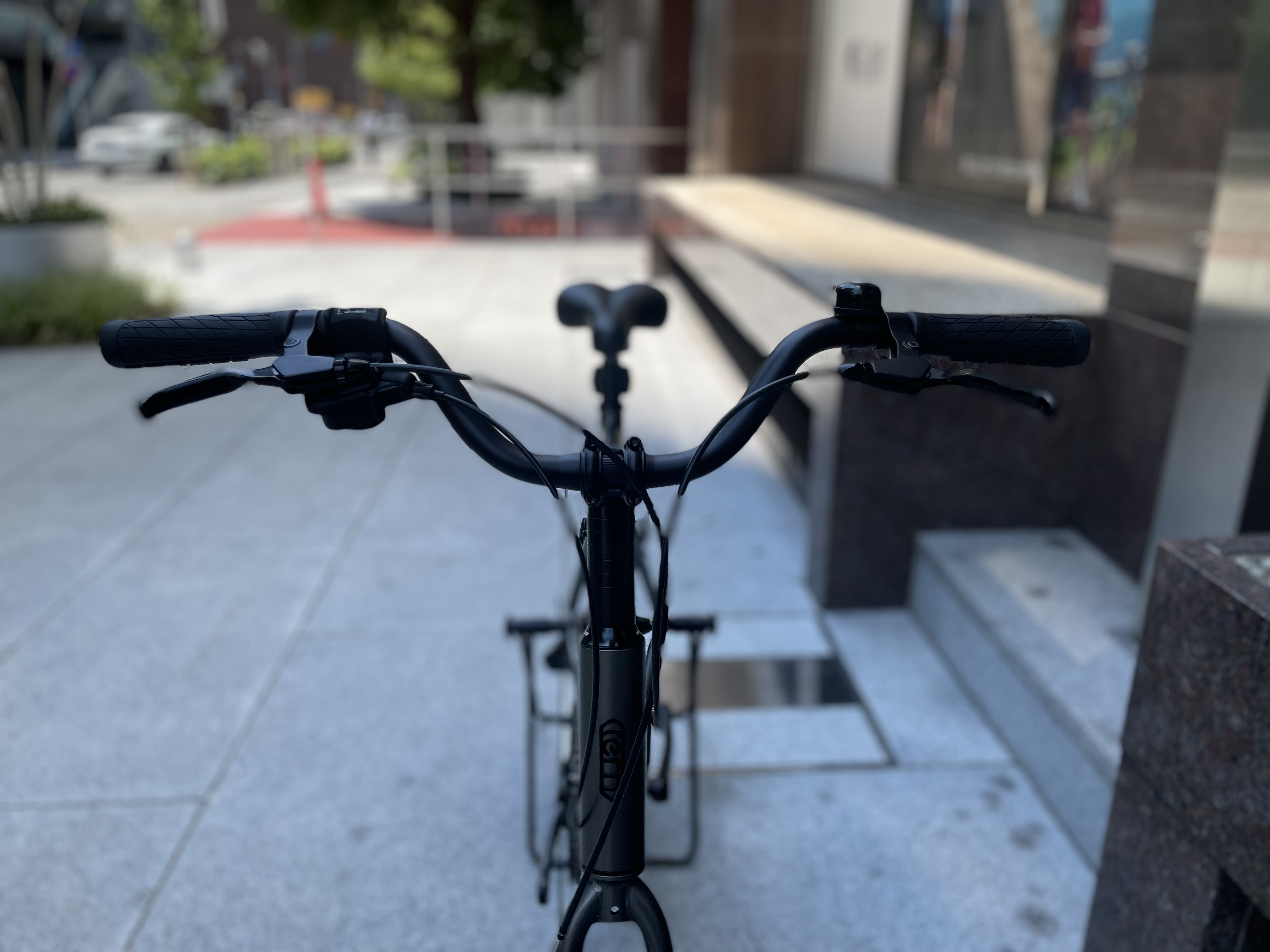 ハンドルもフラットよりもっとアップライトな位置にあるので楽な乗車姿勢で走行できます。ハンドルの形状もカッコイイです。