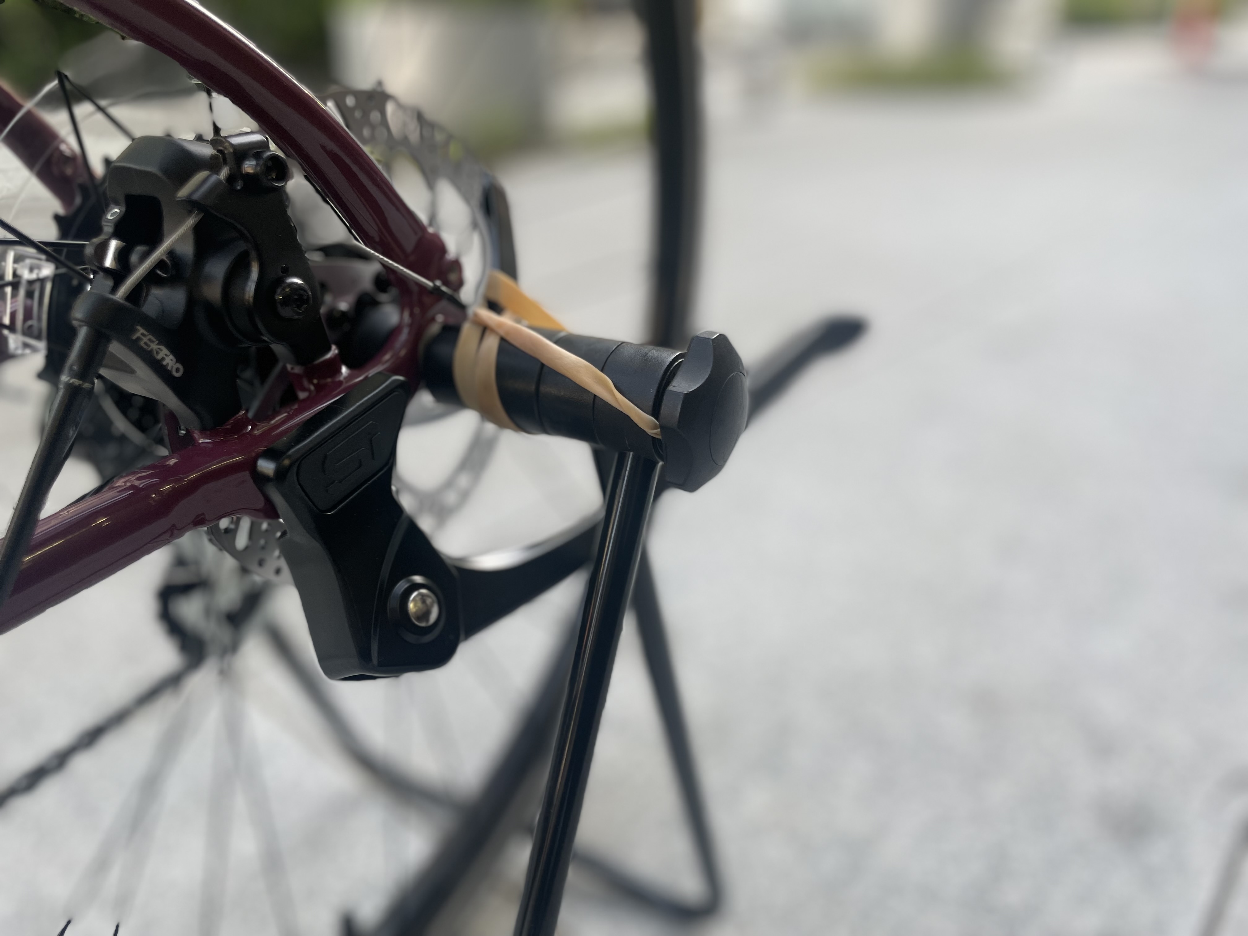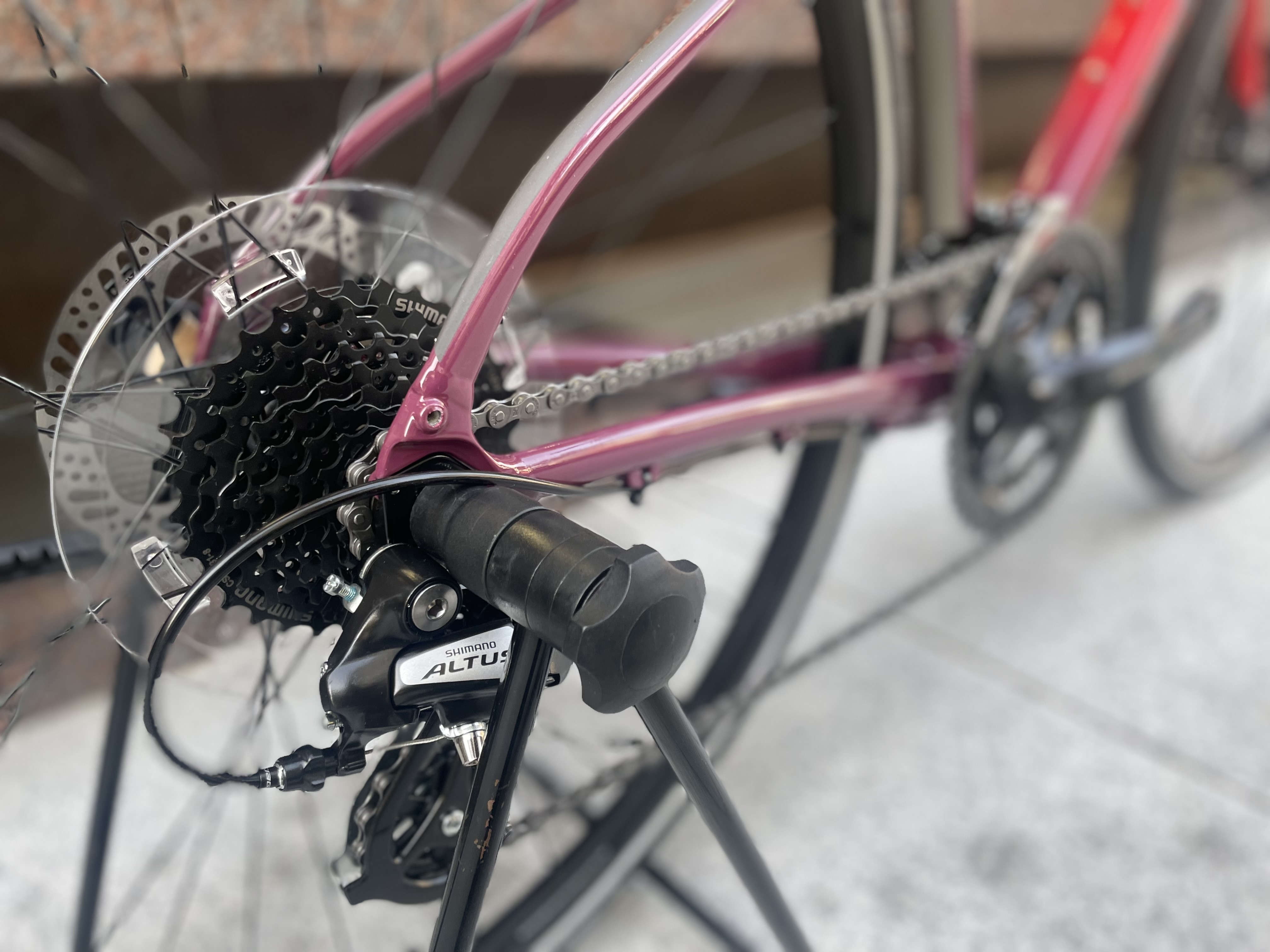 シマノ製の変速機はフロント3速、リア8速の24段変速です。ブレーキは機械式のディスクブレーキを採用し、リムブレーキやブイブレーキほど握力を使わなくてもブレーキがしっかりかかる。というところが強みです。