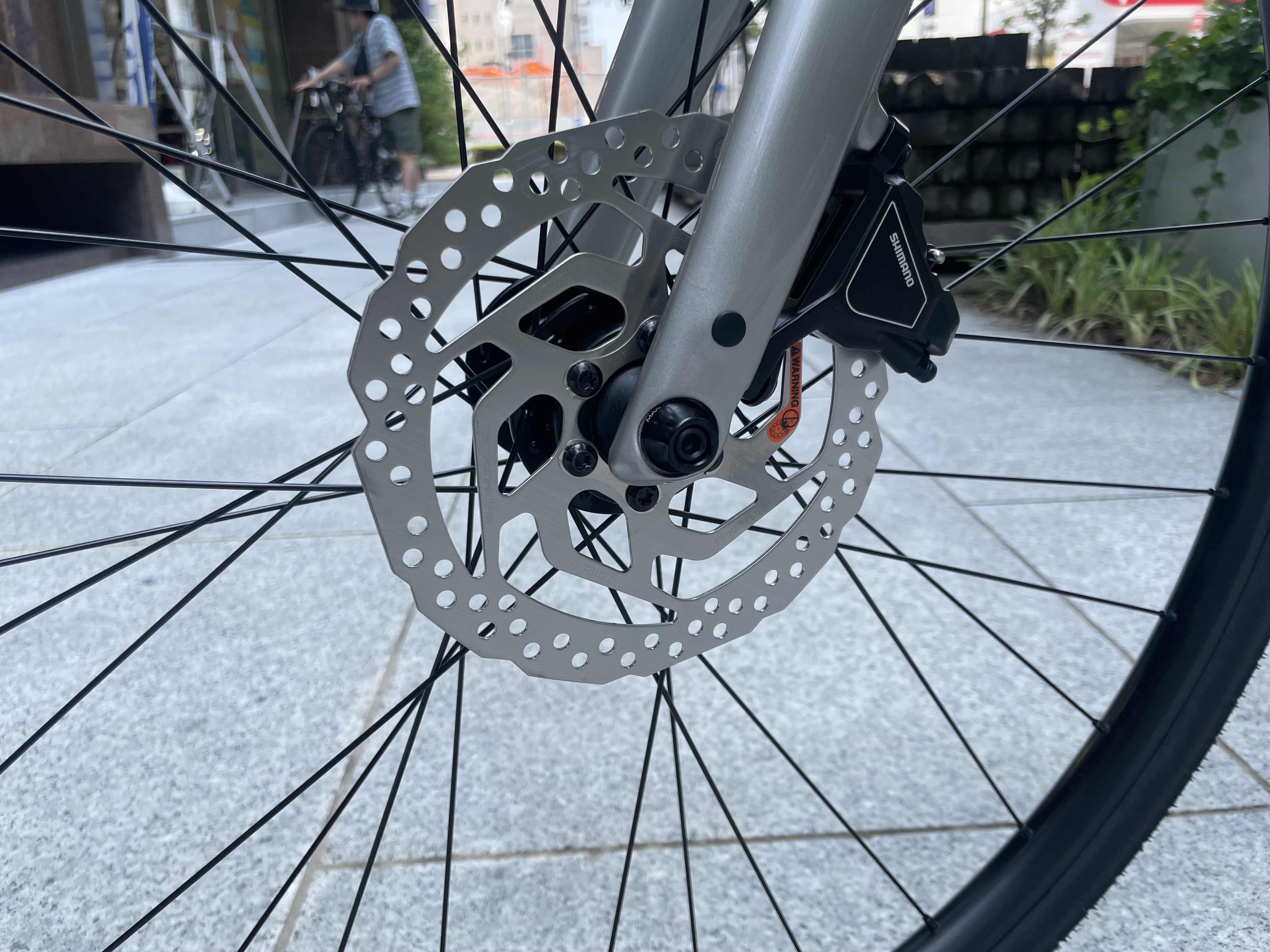 シマノ製の油圧式ディスクブレーキを搭載。サイクリングで距離を走っていると自然にブレーキの回数も増えていきます。油圧式のディスクブレーキは軽いタッチでもしっかりブレーキがかかり、スピードダウンがかないます。よってブレーキをかける際のストレスや手の疲れが軽減されます。もちろん、雨の日の走行も安心できます。