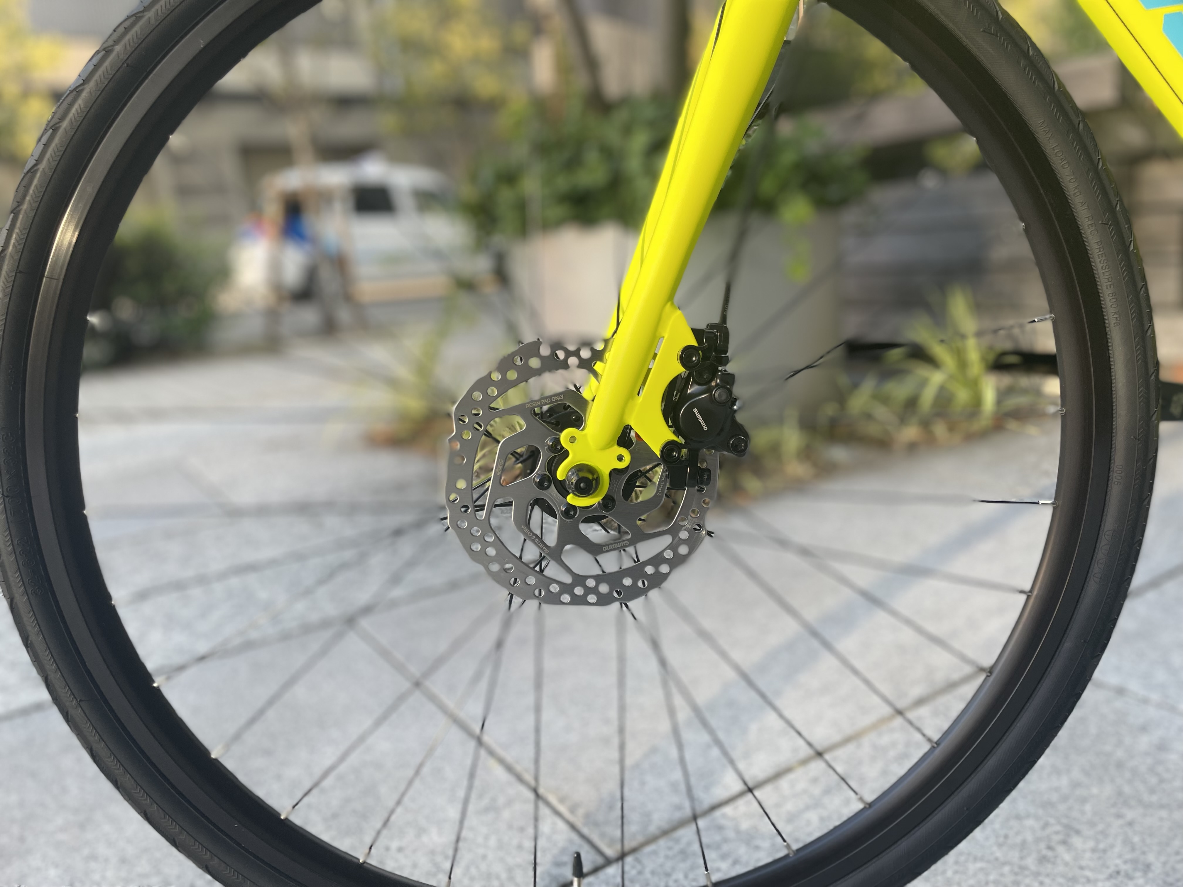 油圧式ディスクブレーキを採用。シマノ製の油圧式ディスクブレーキです。ロードバイクやMTBでは既にほとんどのバイクにディスクブレーキが 搭載されておりますが、クロスバイクにもその流れがきています。今店頭にあるクロスバイクも半分以上がディスクブレーキ搭載のものです。そんな油圧式のディスクブレーキのメリットは、制動力が高い、軽いタッチでブレーキが効く、スピードコントロールがしやすいです。