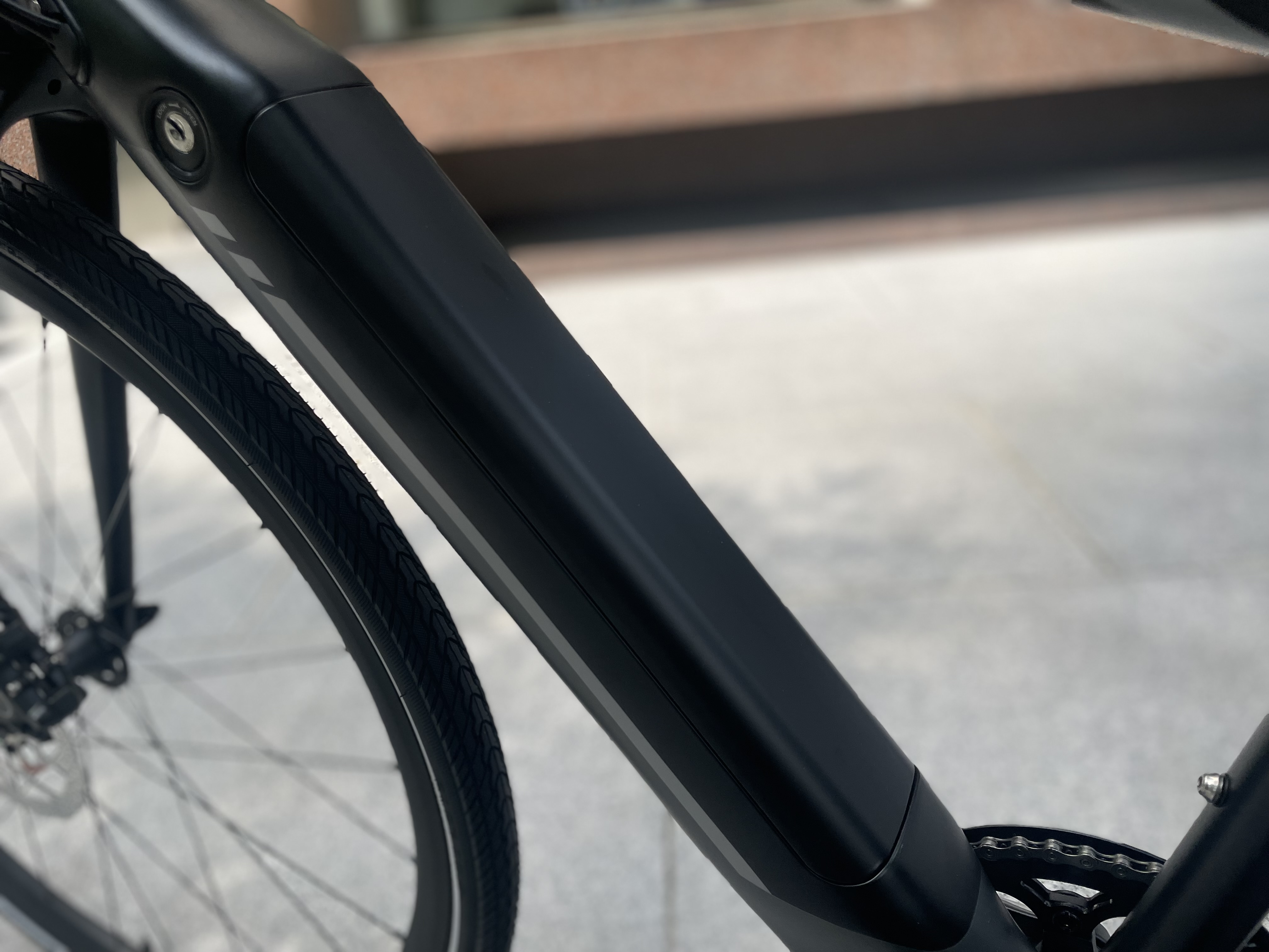 バッテリーがフレーム内蔵となっており、目立たず、すっきりした印象です。外観を損なわないのでスマートで一見E-bikeとは分かりにくいかと思います。