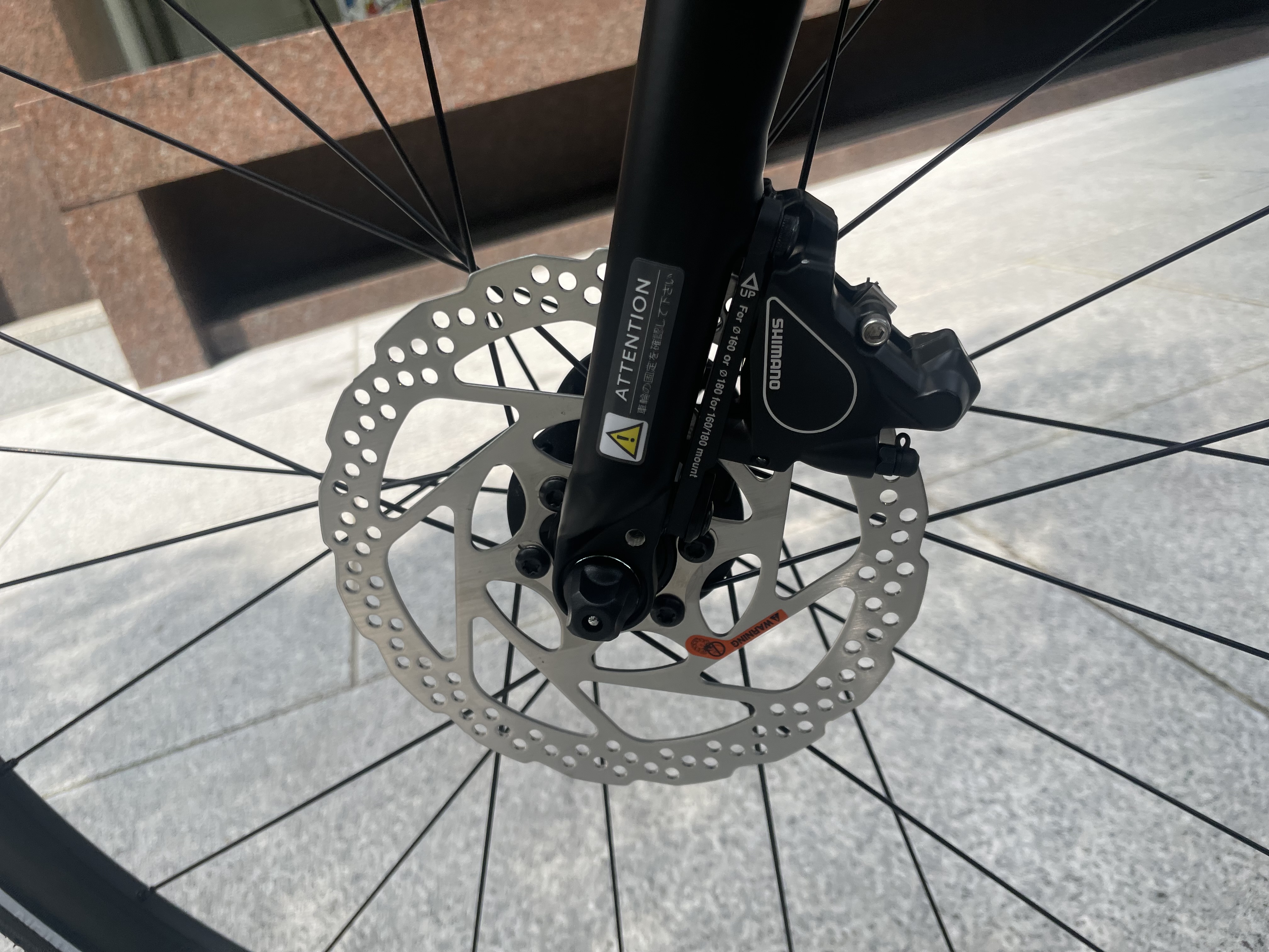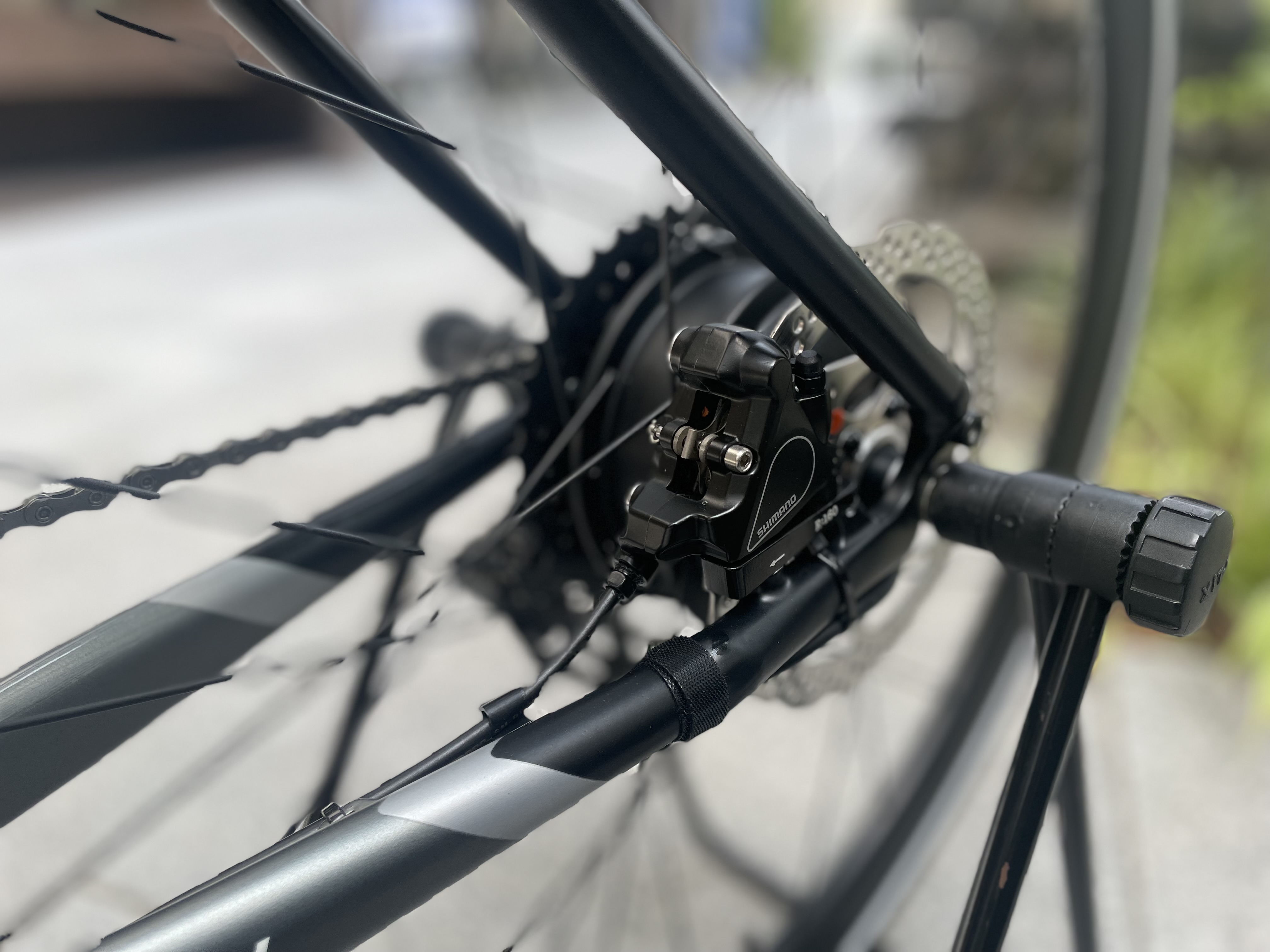 こちらもシマノ製の油圧式ディスクブレーキ搭載です。重量が15kg以上あるE-bikeには油圧式ディスクブレーキが搭載されていますと制動力を発揮して、しっかり停まってくれますので安心して走行することができます。