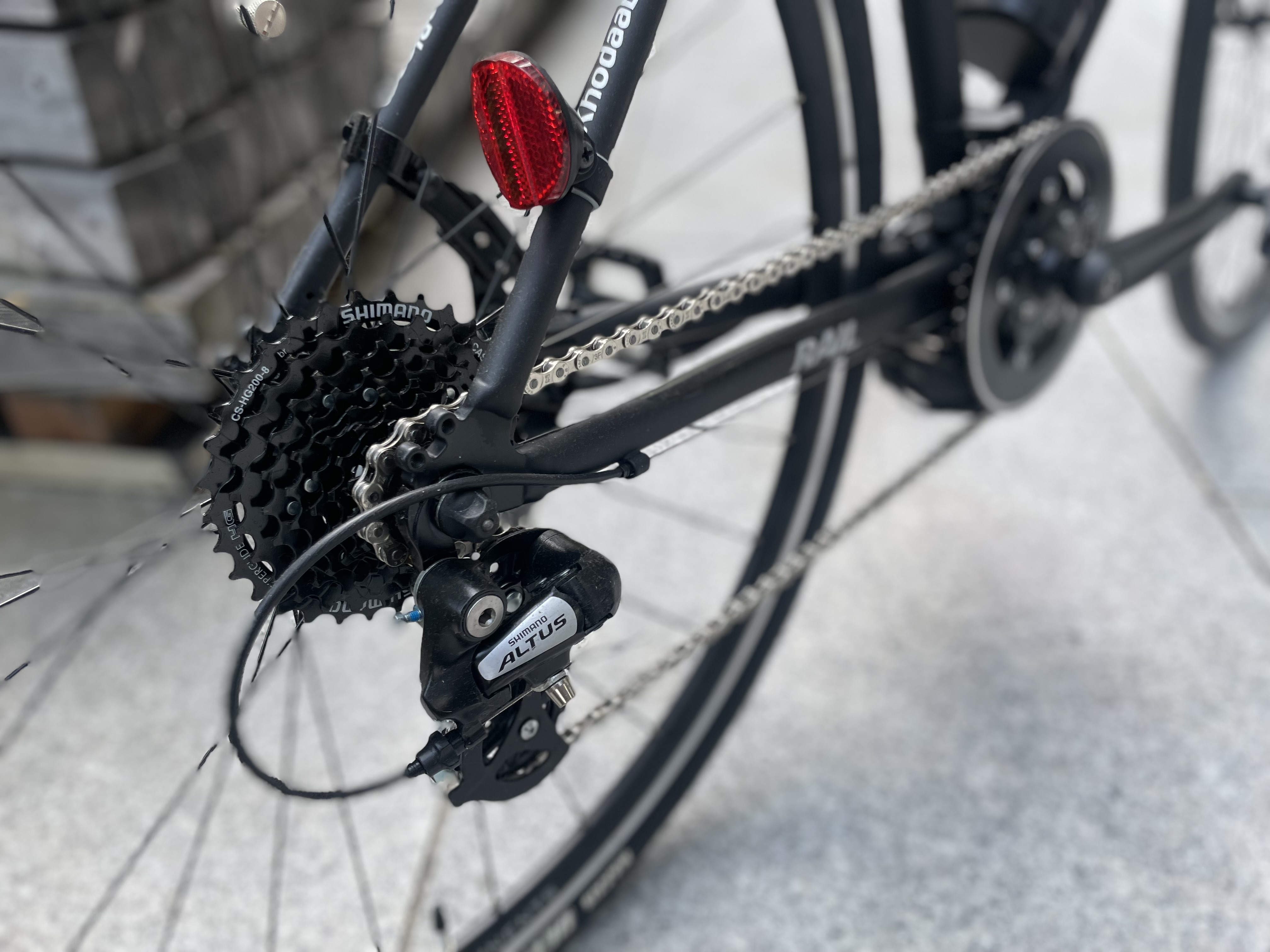 変速機はシマノ製。フロントの変速ななしで、リア8速のみです。