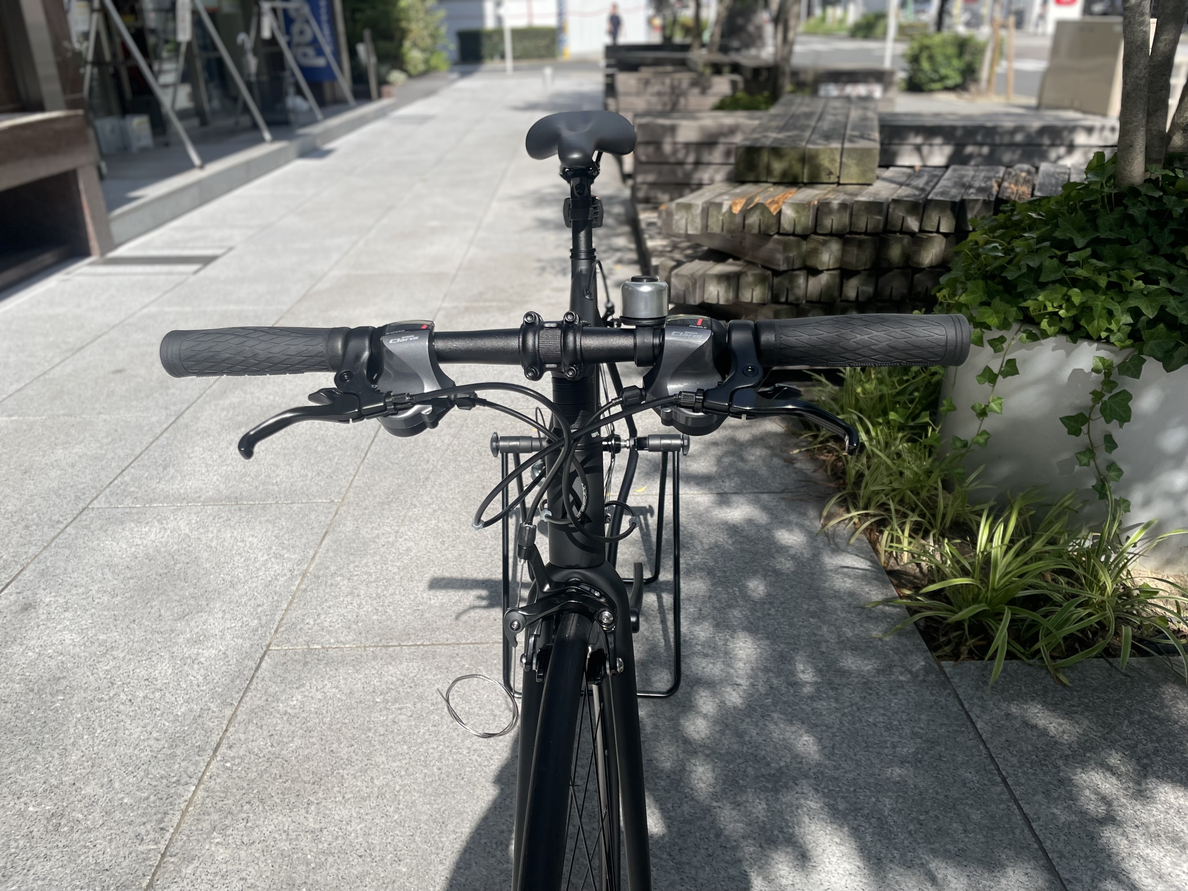 ハンドルはフラットバーなので前傾姿勢がきつくなりすぎず、ロードバイク初心者やクロスバイクからのステップアップにも最適です。ハンドル幅は短めでコンパクト。街中の狭い道もスムーズに走行できます。