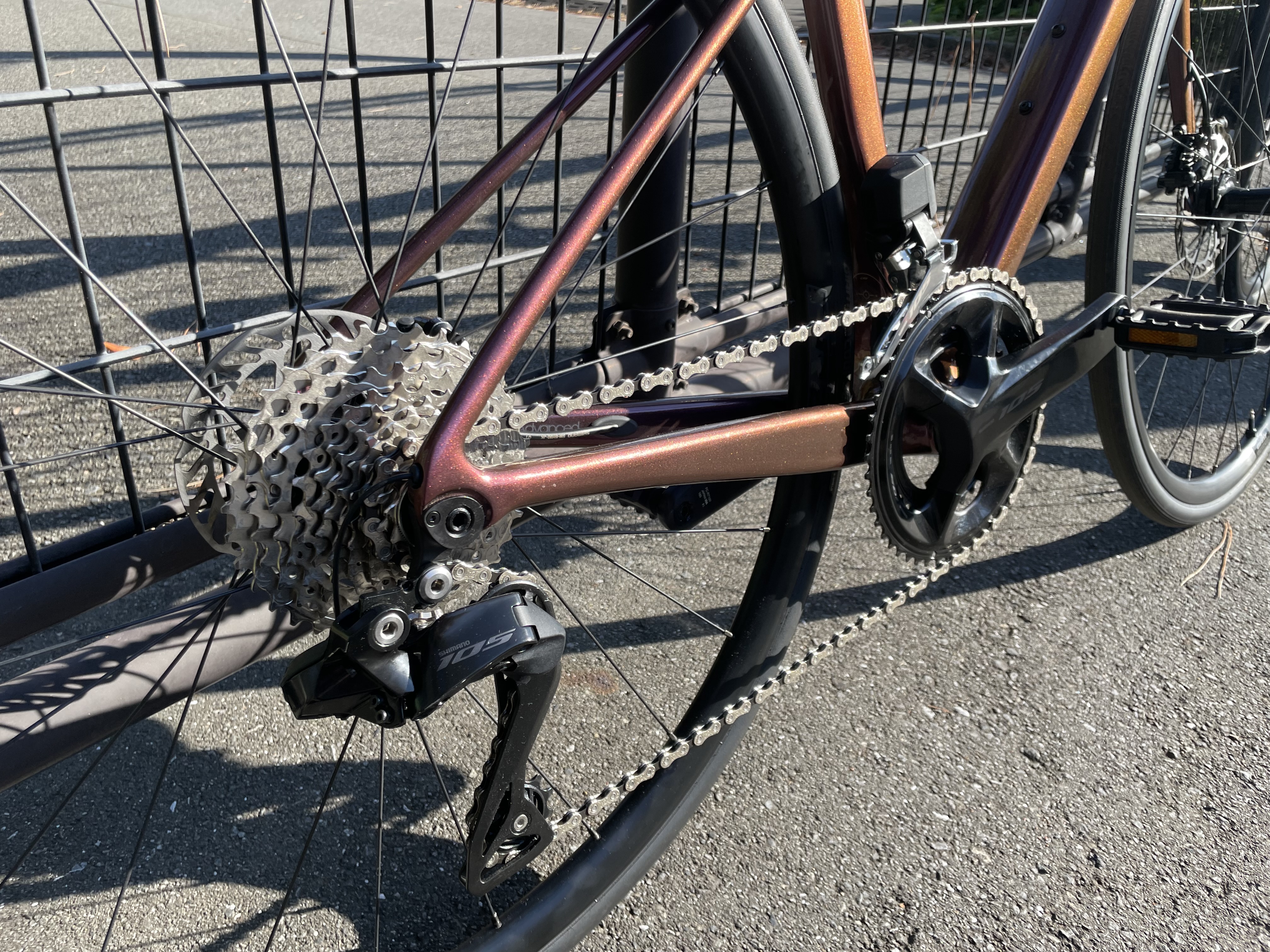 変速がめちゃくちゃ簡単です。105Di2が搭載されており、ボタンをカチっと押せば楽に変速できるのです。自分にはこんな素晴らしいスペックは合わないのでは…と最初はビビッていましたが、レバーを押す力よりボタンの方が遥かに簡単&楽なので、力が入りにくい女性にこそオススメしたいなと思いました。初心者の方でも◎。