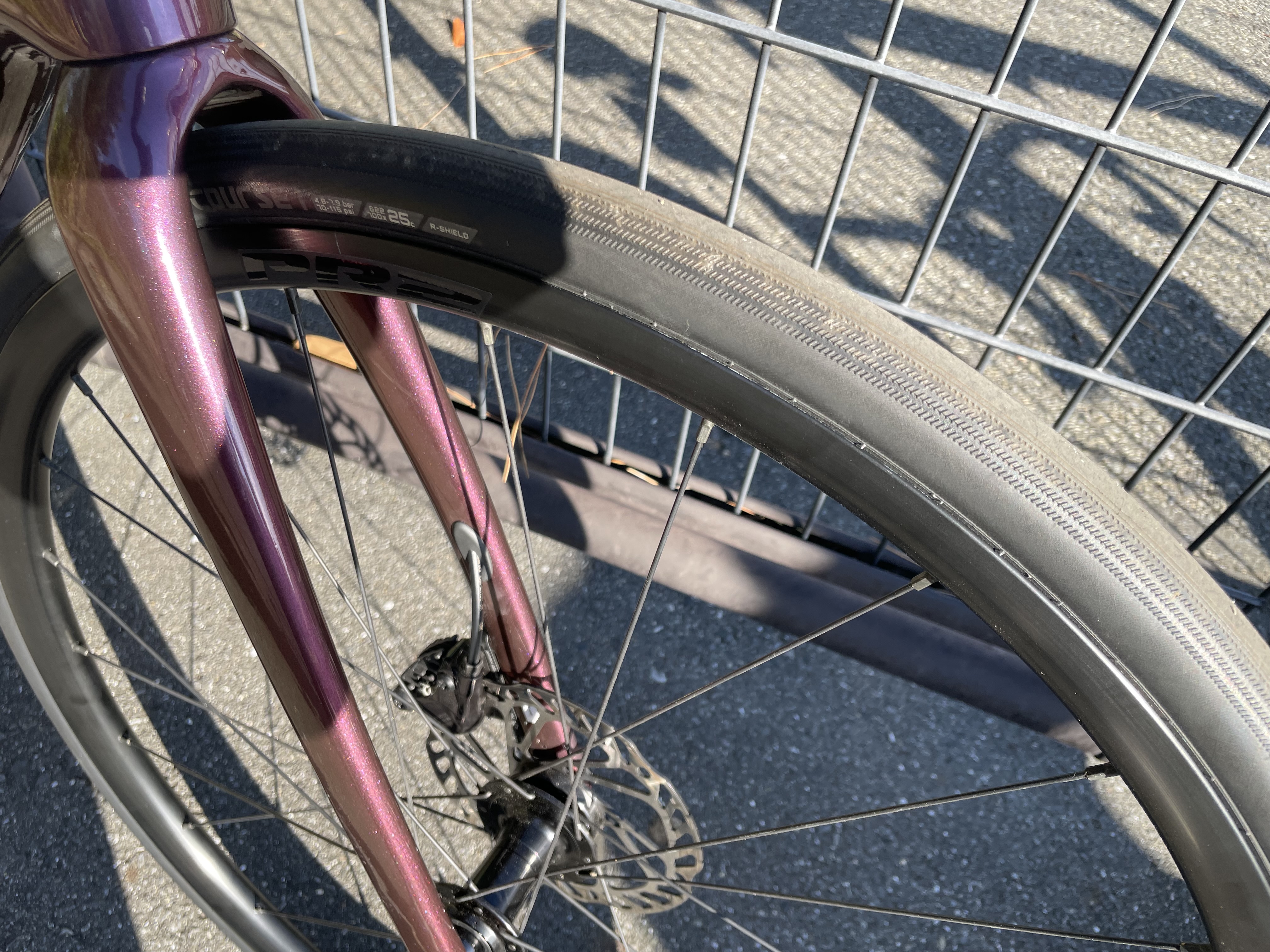 タイヤは細めの25C。細いのに乗りやすいと感じたのはおそらく短い距離しか走っていないからだと思いますが、快適にスイスイ進んでいく。乗っていて「わぁー!これだ!」と思ったのは初めてです。これ、欲しい!!(切実)