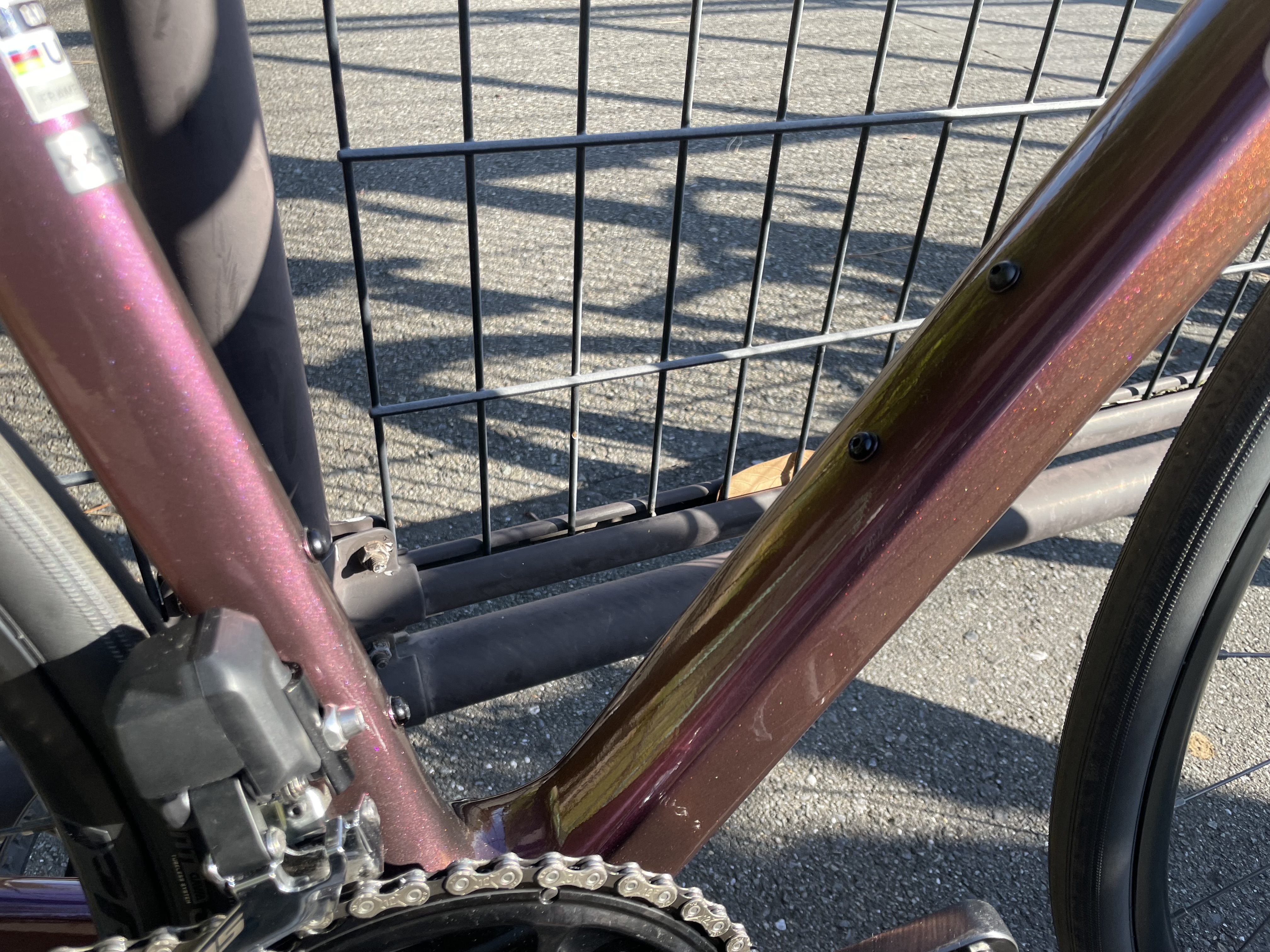 小さいフレームの自転車は、ボトルケージなどの台座って、ダウンチューブにしかなかったりするのですが、ちゃんと2つあるんですよ~!!おそらく標準的なサイズの方からしたら当たり前のことなのかもしれないですが、小さいフレーム勢には大事なポイント&おどろきの発見でした。これは地味に嬉しい。