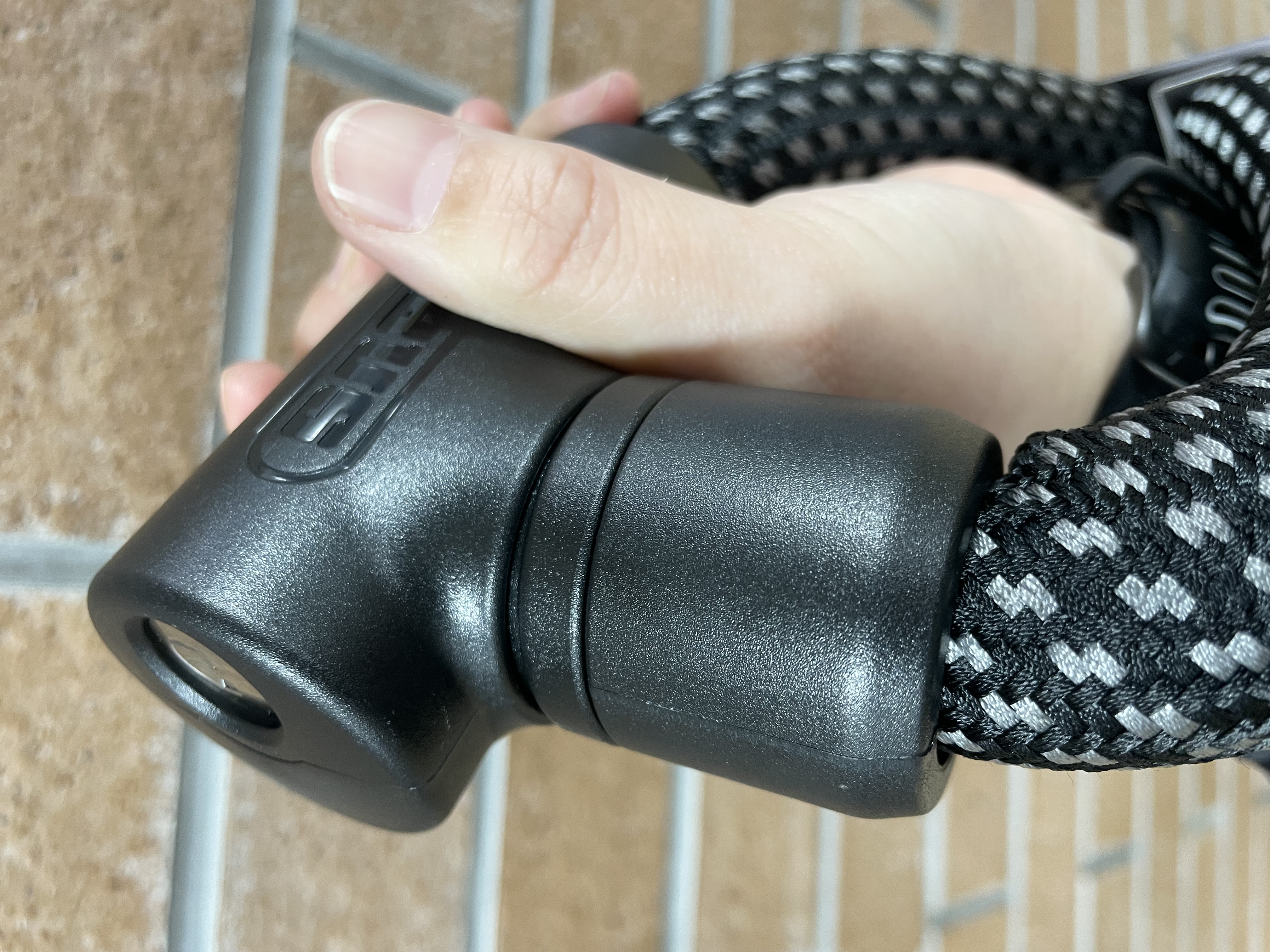 よくあるチェーンロックって中に鎖が入っていてカチャカチャしていますよね。フレームに当たったりすると傷が付いたりする恐れがありますが、こちらはむにむに~。やわらか~。むにゅっとずっと触っていたくなるような感触です。フレームの傷つきにくいですし、自身にたすき掛けしたり、触れる物すべてにやさしいです。