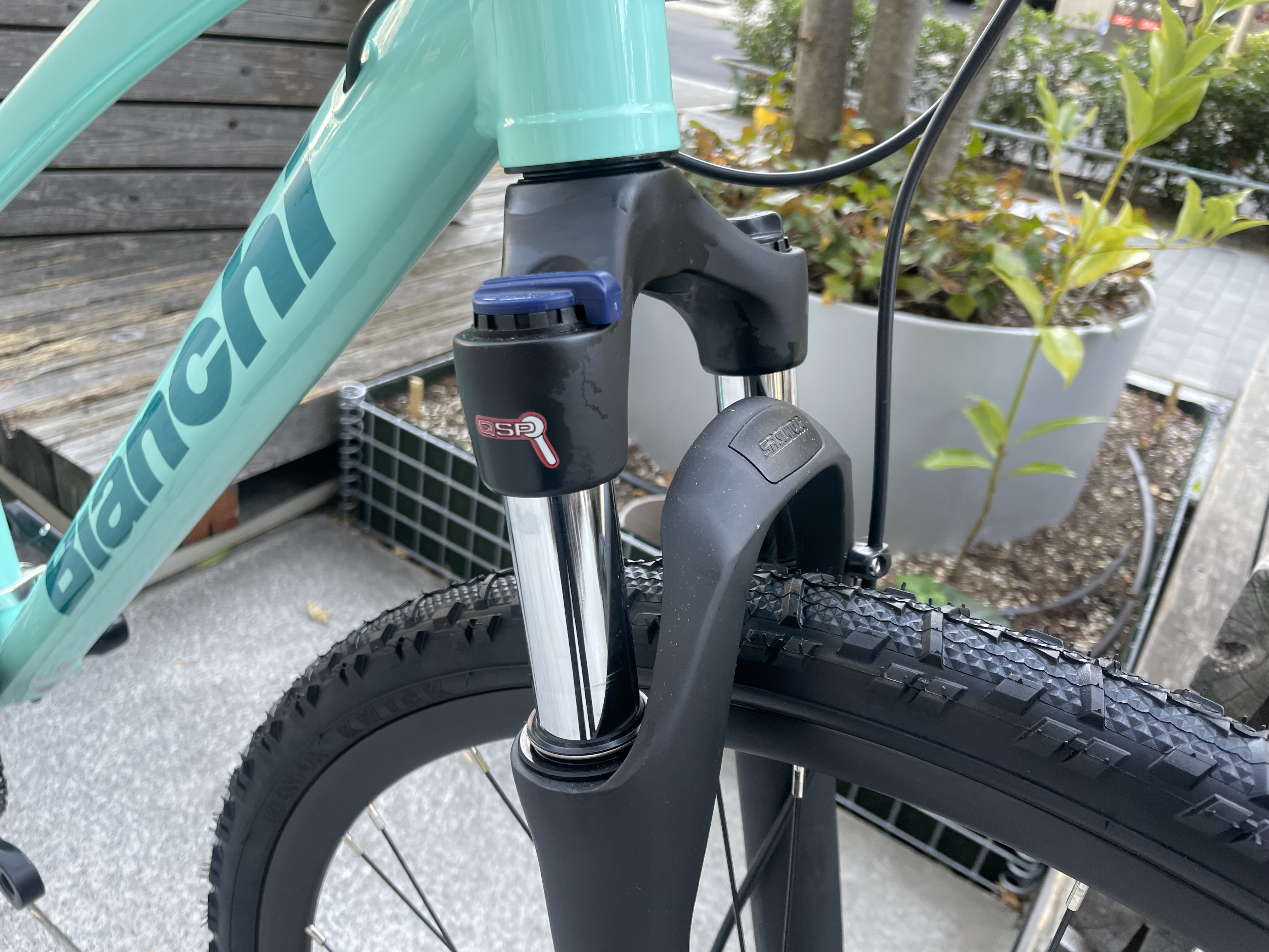 MTBのようにフロントにサスペンションが搭載されており、街中の段差も楽々乗れます。