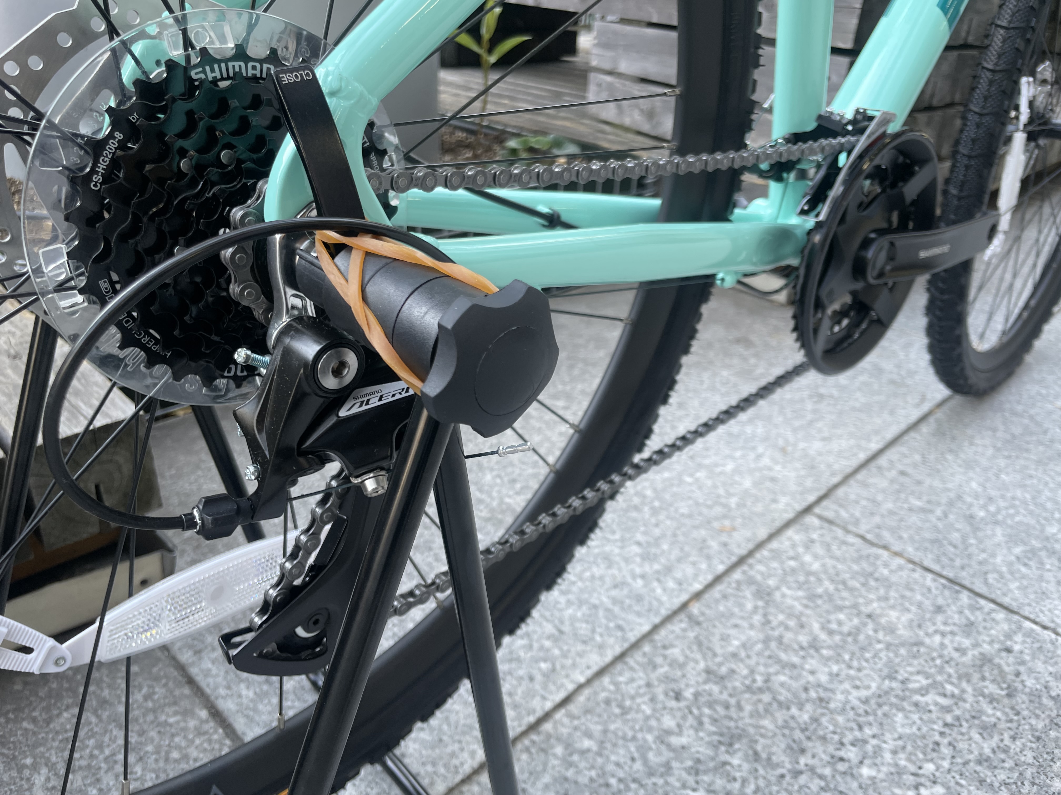 ブレーキはSHIMANO製油圧式ディスクブレーキです。雨の日の走行も安心ですし、スピードの調節がしやすい事が油圧ディスクブレーキの持ち味ですね。