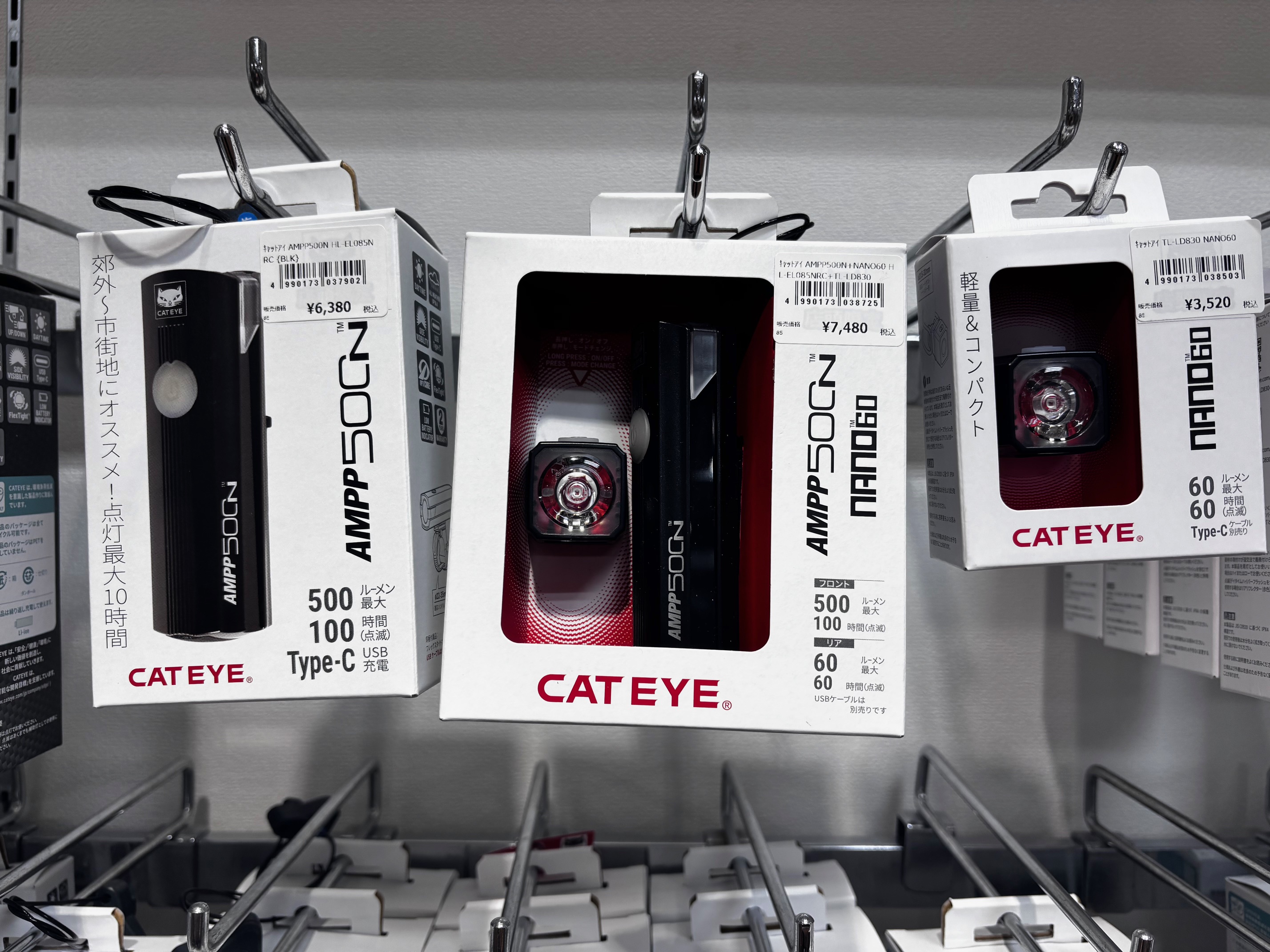 オススメの商品はCATYEYのAMPP500(フロントライト)とNANO 60(テールライト)の前後セット(画像中央)になっている物です。