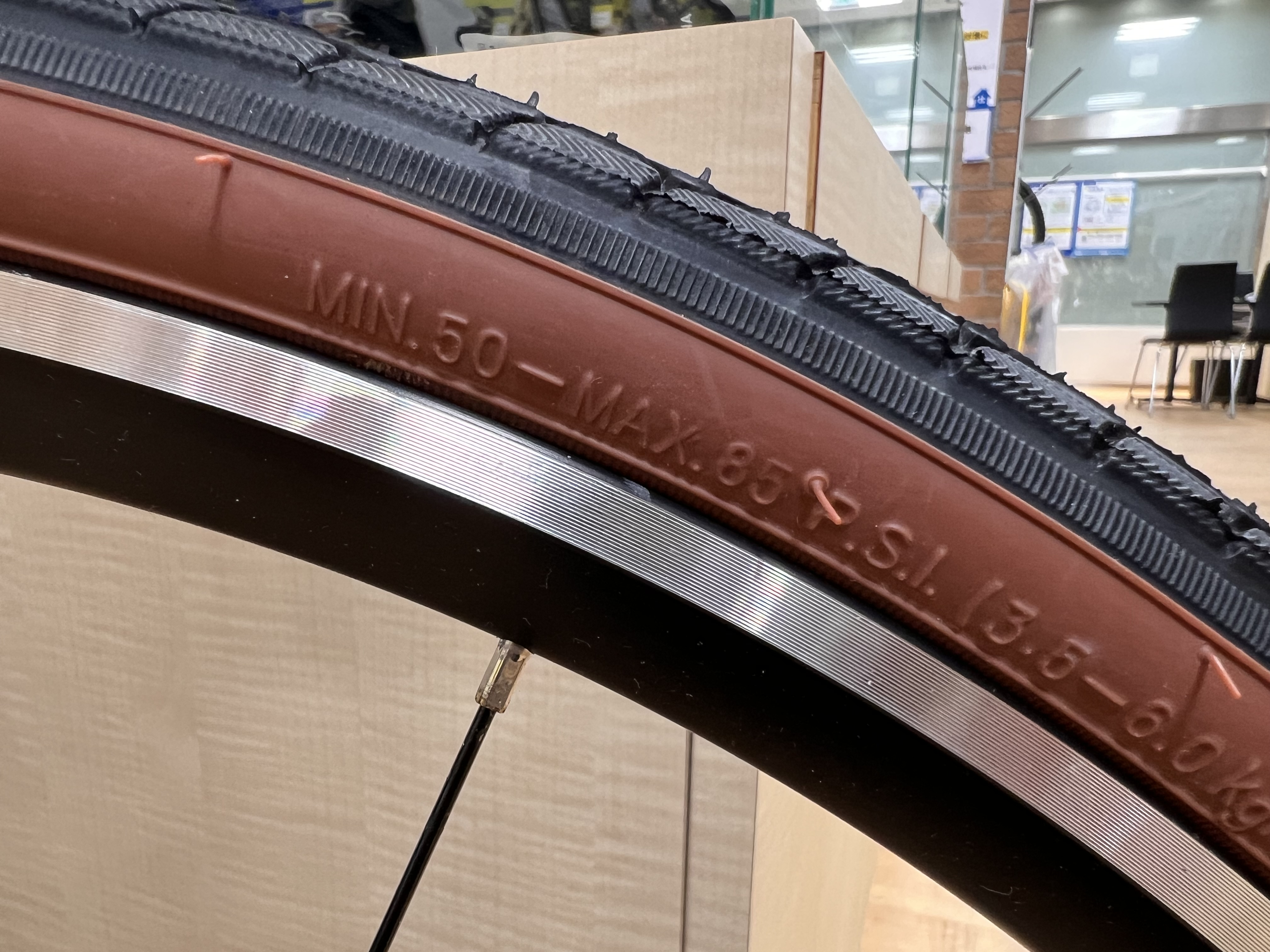 タイヤ側面に規定の空気圧が書かれているので、メーターを見つつ、しっかり空気圧維持しましょう!